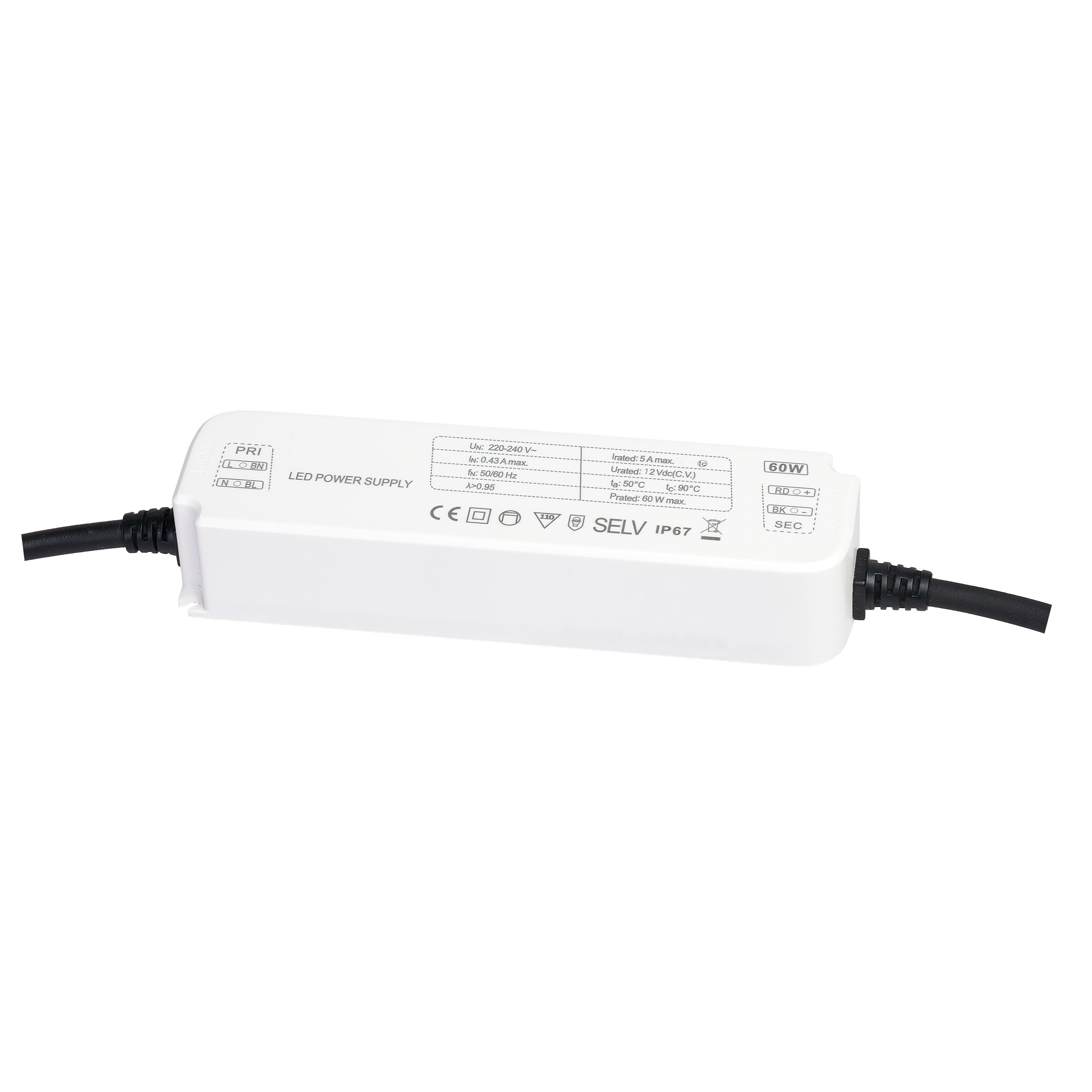 Alimentation IZI'TRONIC 12 60W. Convertisseur électronique pour éclairage LED tension constante. Entrée : 220-240VAC. Sortie : 12VDC/5A. Classe II, IP67, câblé de 0,3m. Non dimmable.