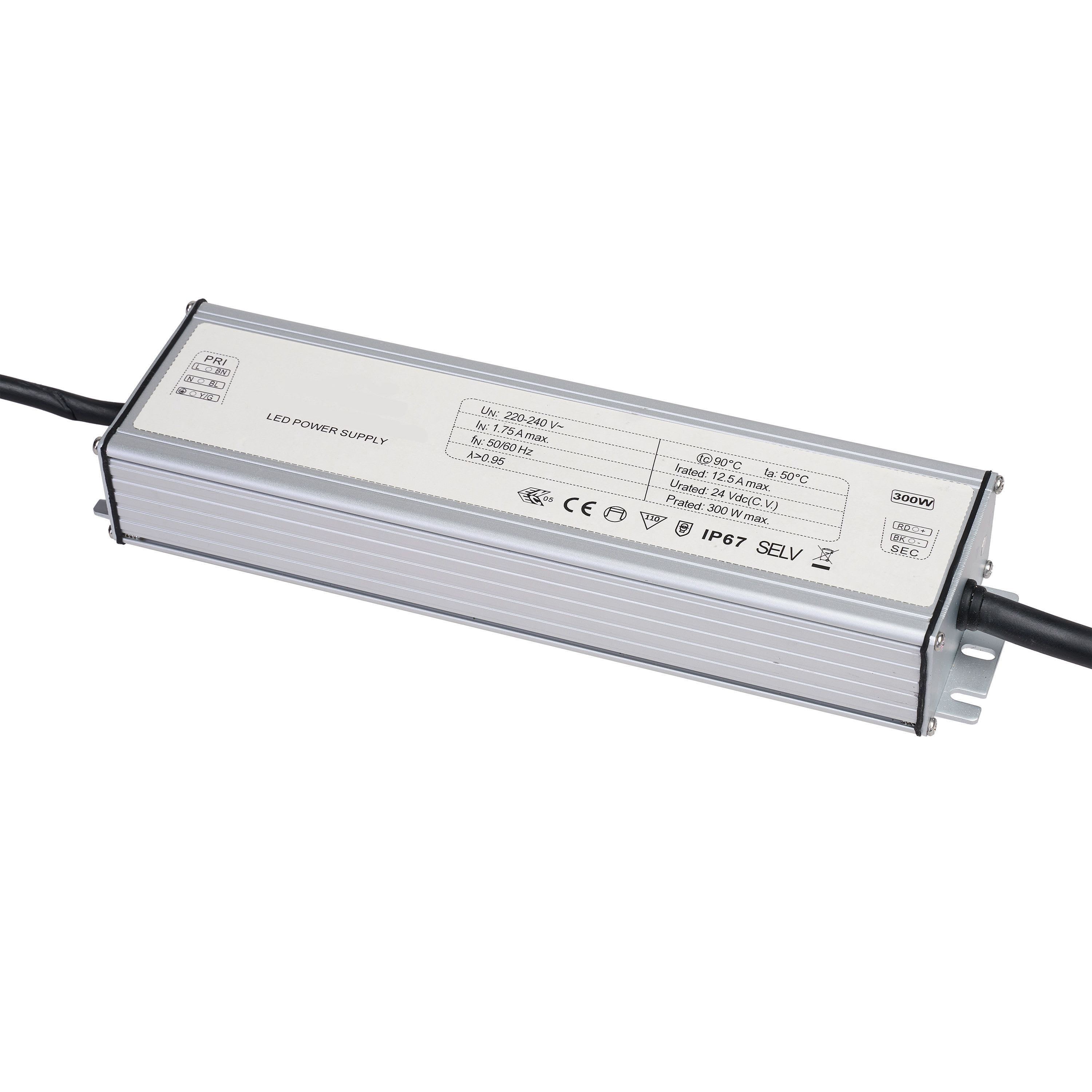 Alimentation EUROPOLE IZI'TRONIC 24 300W. Convertisseur électronique pour éclairage LED tension constante. Tension d'entrée : 220-240VAC. Tension de sortie : 24VDC. Courant d'entrée : 1,75A. Courant de sortie : 12,5A. Classe de protection : I, IP67, Câblé de 0,65m en entrée et 0,3m en sortie, H05RN-F (prim : 3x1mm²/sec : 2x2,5mm²). Non dimmable. Nombre d'entrée(s) primaire(s) : 1, nombre de sorties physiques : 1. Températures de fonctionnement : -40°C/+50°C.