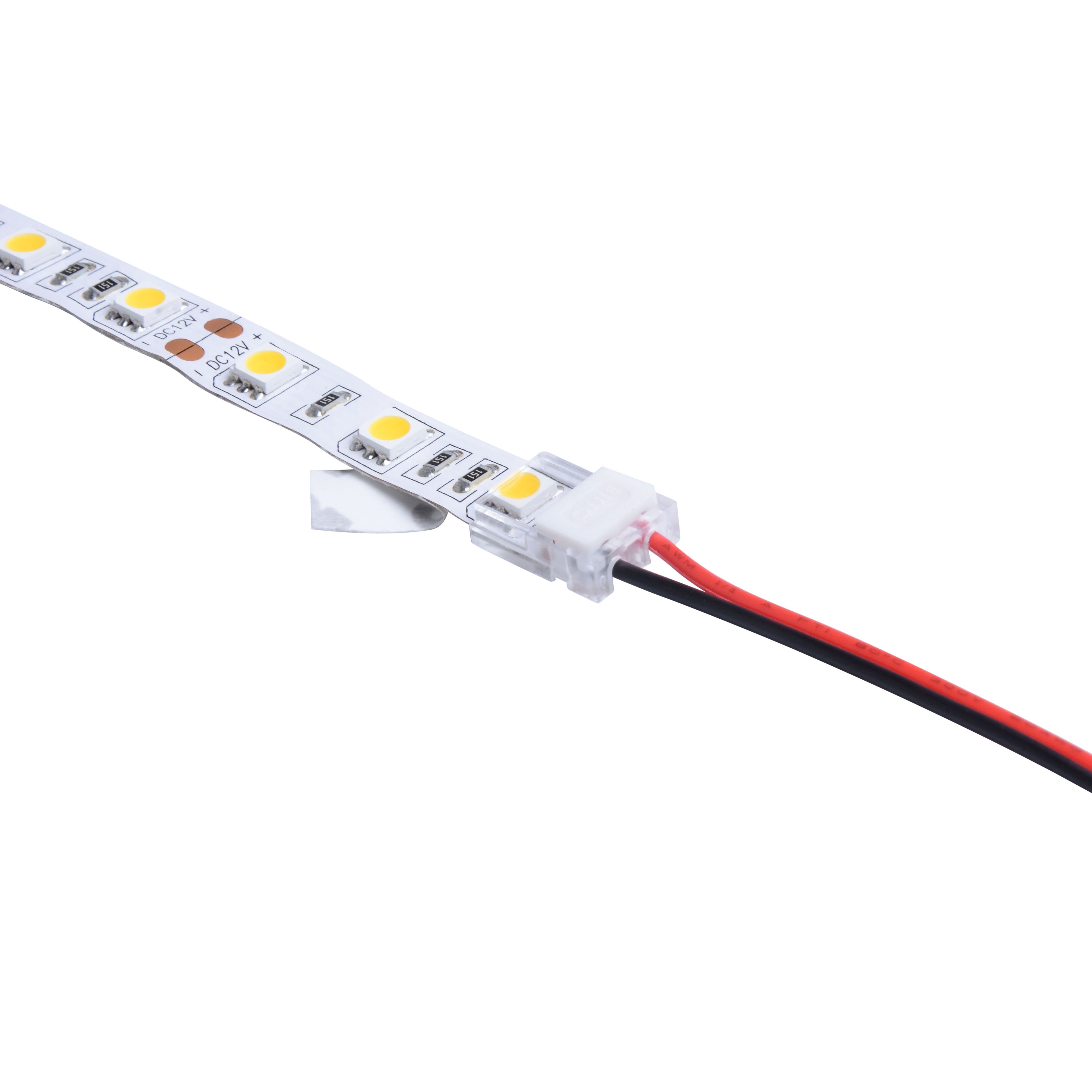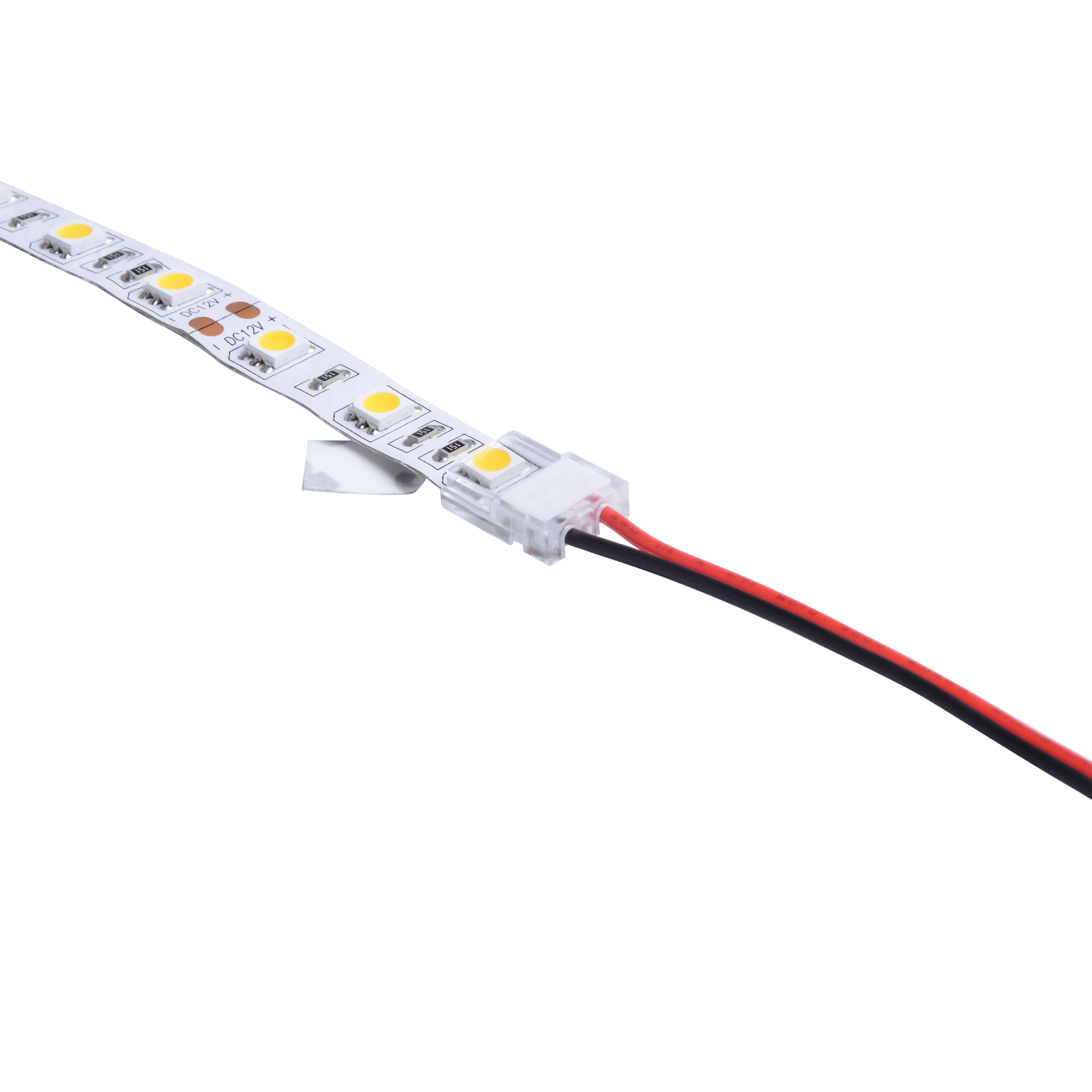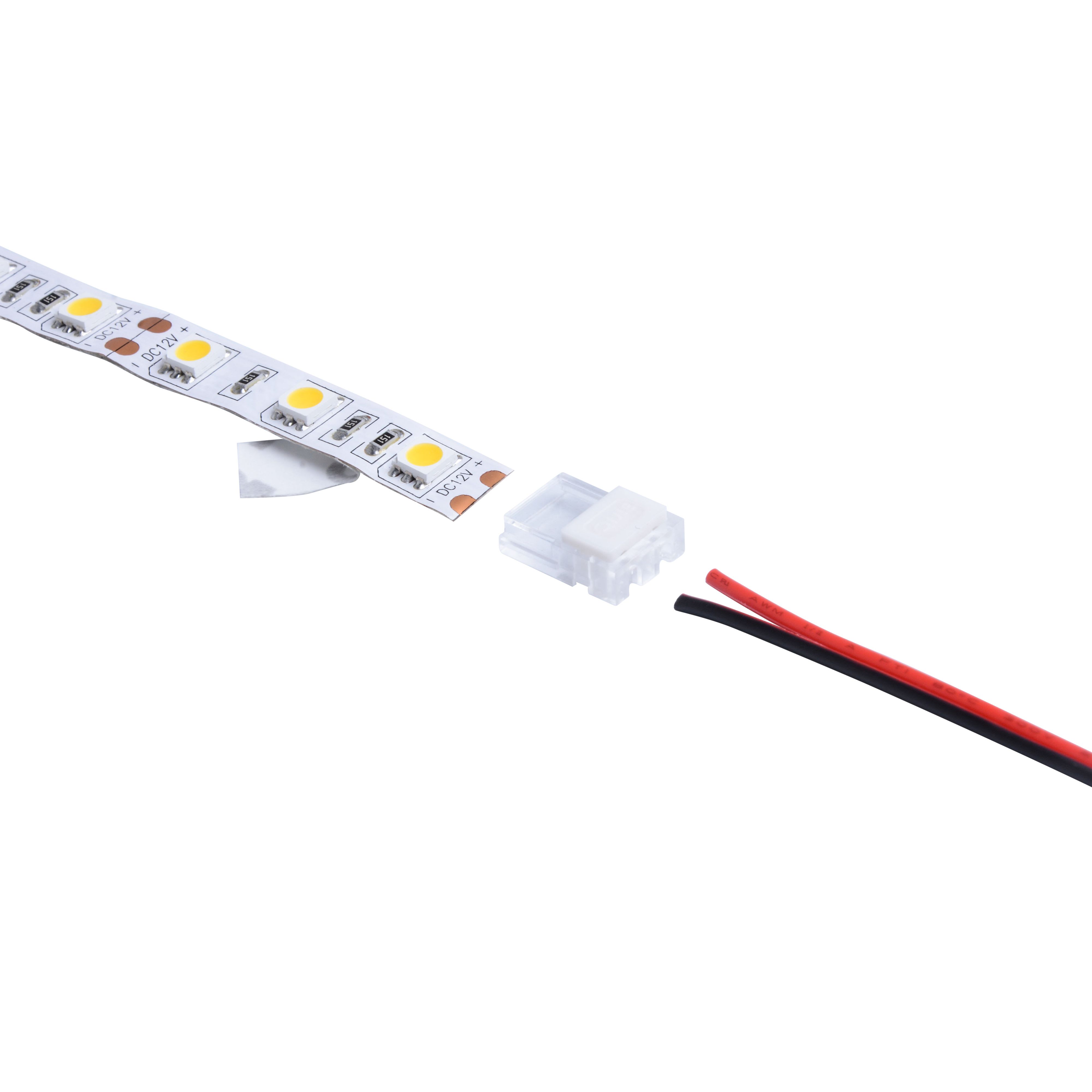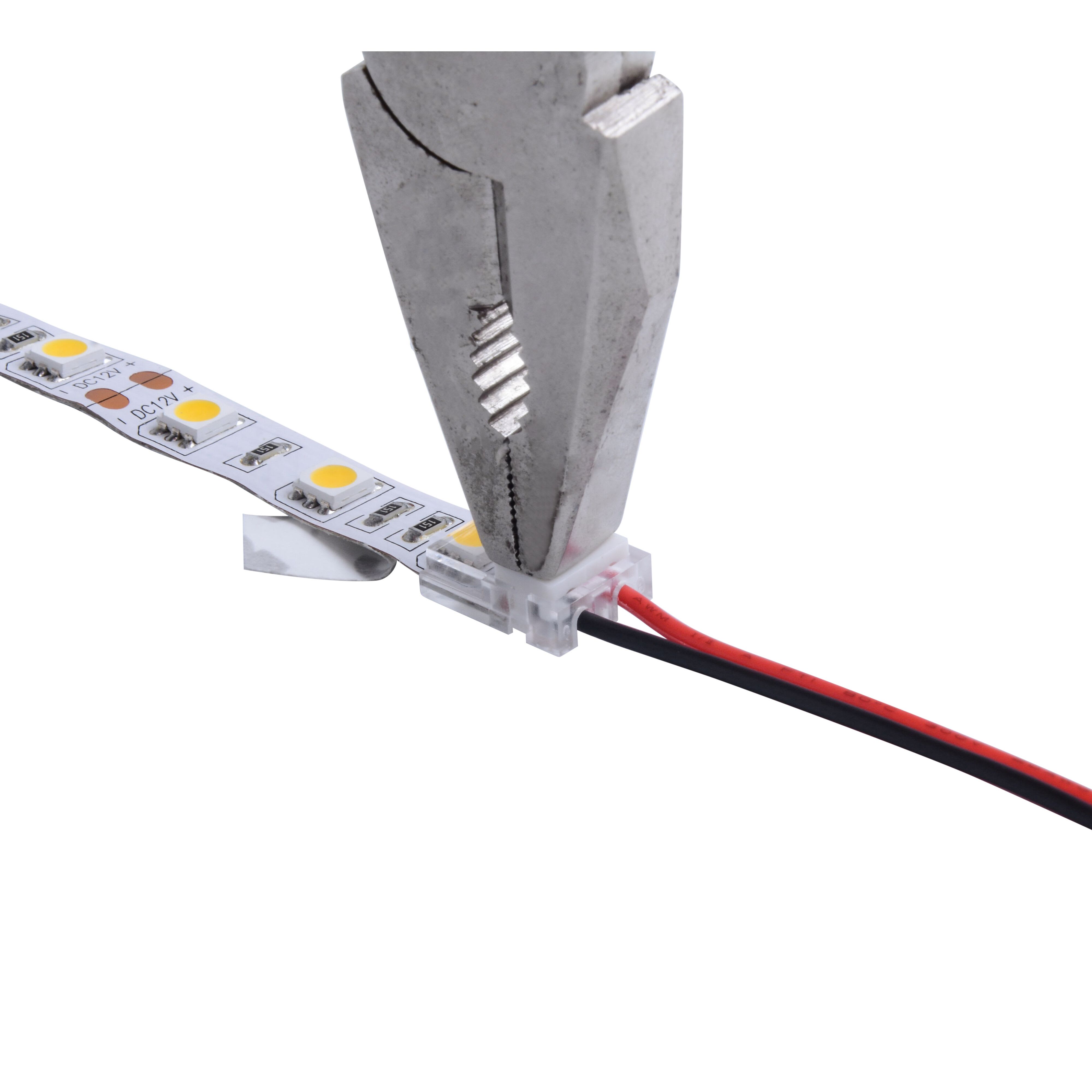 Connectique rapide 2 pôles pour linéaire 12/24V de 8mm : Bandeau - câble IP20. Conçu spécialement pour une connexion sans soudure, fixation par simple clip. Installation dans un profil aluminium possible. Vendu à l'unité.
