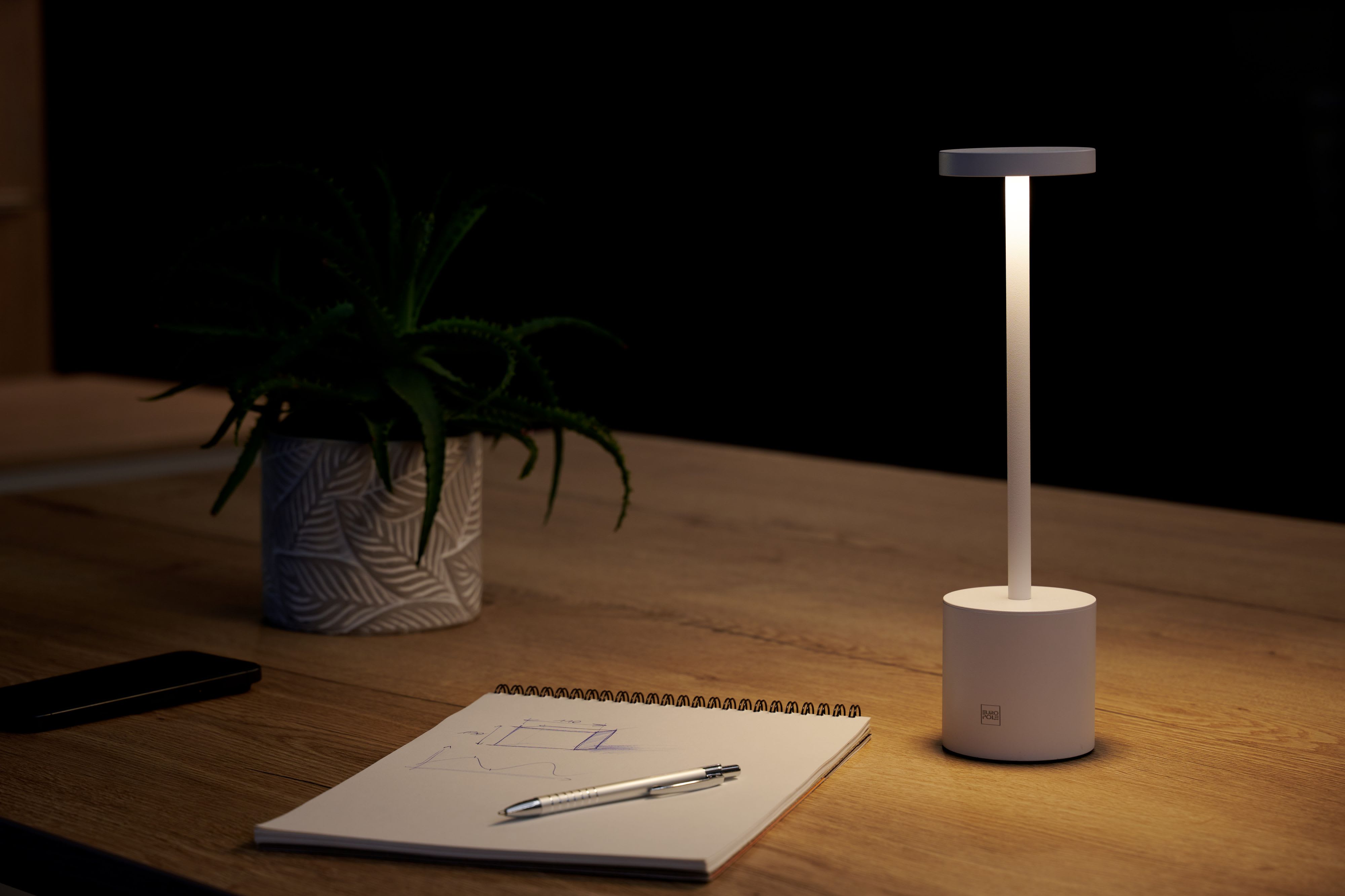 Lampe à poser EUROPOLE TAK 1 blanc mat sablé, hauteur : 30cm, fixe, blanc 2700K/4000K/5000K, IRC85, 2W, 200lm (100lm/W), diffuseur opale 120°. Batterie rechargeable non remplaçable. Type de batterie : Lithium. Autonomie : De 6h à 12h. Classe de protection III, IP44, IK03. Durée de vie : 30000h. Dimmable : Oui, variation par pression pour réglage de l'intensité/par impulsion pour réglage de la température de couleur. Matériau : aluminium/caoutchouc. Utilisation : intérieur. Températures de fonctionnement : -20°C/+40°C. Mode de pose/installation : à poser.Base lestée avec caoutchouc anti-dérapant, câble USB-C 5VDC inclus.