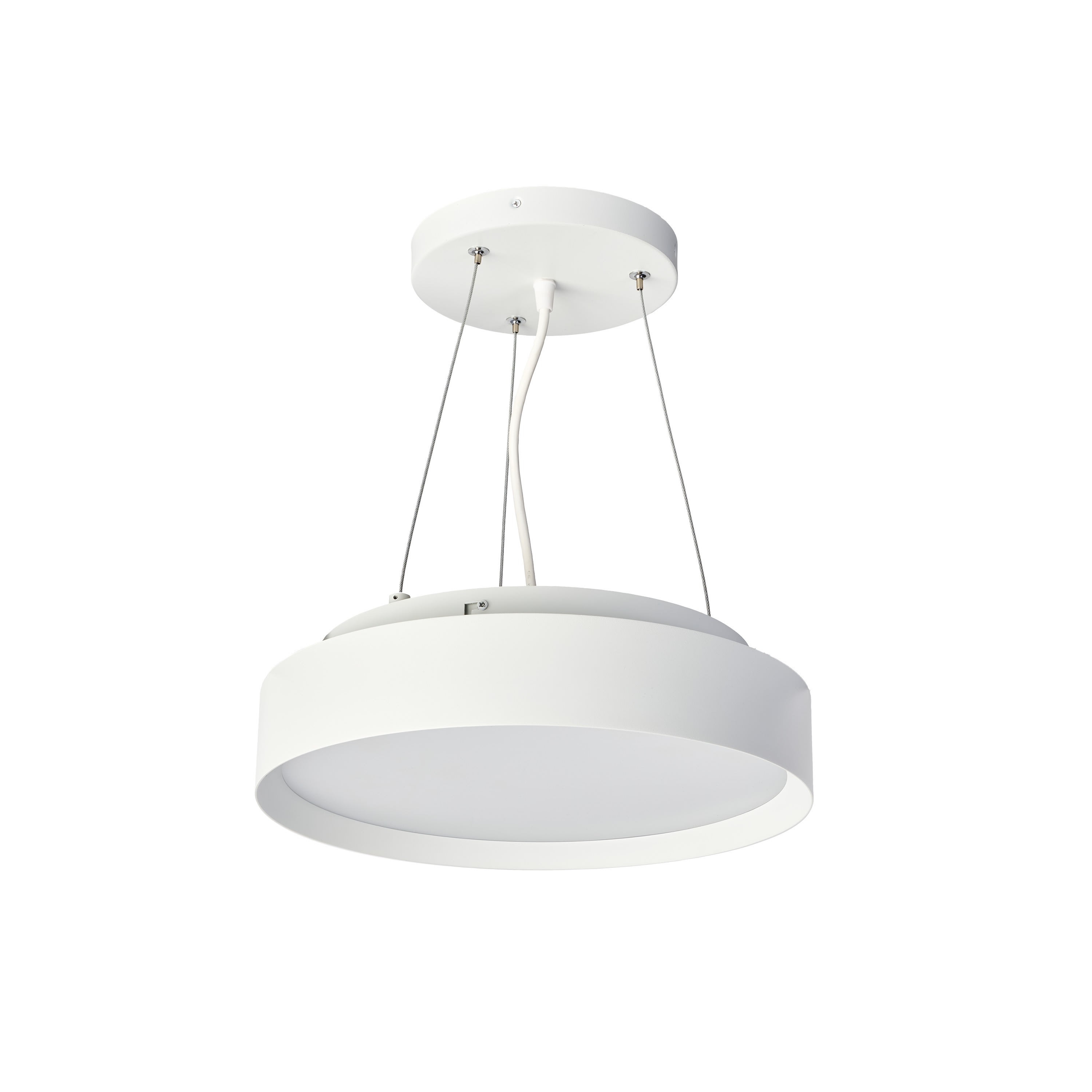 Plafonnier EUROPOLE MILA 1, diamètre : 35cm rond blanc mat finition sablé, blanc 4000K 30W 3150lm (105lm/W), IRC90 SDCM3, diffuseur opale 120°, 230VAC. Durée de vie : 50000h. Dimmable : Non. Classe de protection I, IP20, câblé de 2m, H05SS-F 3x0,75mm². Mode de pose/installation : saillie. Compatible isolant(s) : non. Type de fixation : embase à visser sur le support - 1/4 de tour. Matériau : aluminium. Températures de fonctionnement : -10°C/+40°C. Alimentation incluse dans l'appareil, montage en suspension avec le kit de suspension. Autres finitions, puissances, températures de couleur et diffuseur microprismatique sur demande.