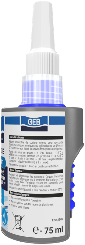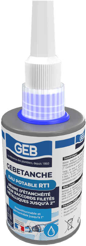 Gebetanche eau potable RT1. Résine anaérobie pour l?étanchéité des raccords filetés métalliques jusqu?à 2 pouces pour les circuits d?eau potable. Flacon accordéon 75 ml. Couleur blanc crème