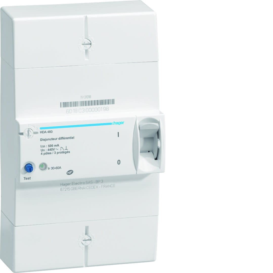 Hager - Disjoncteur de branchement différentiel 4 pôles 30/60 A 500 mA instantané - HDA460