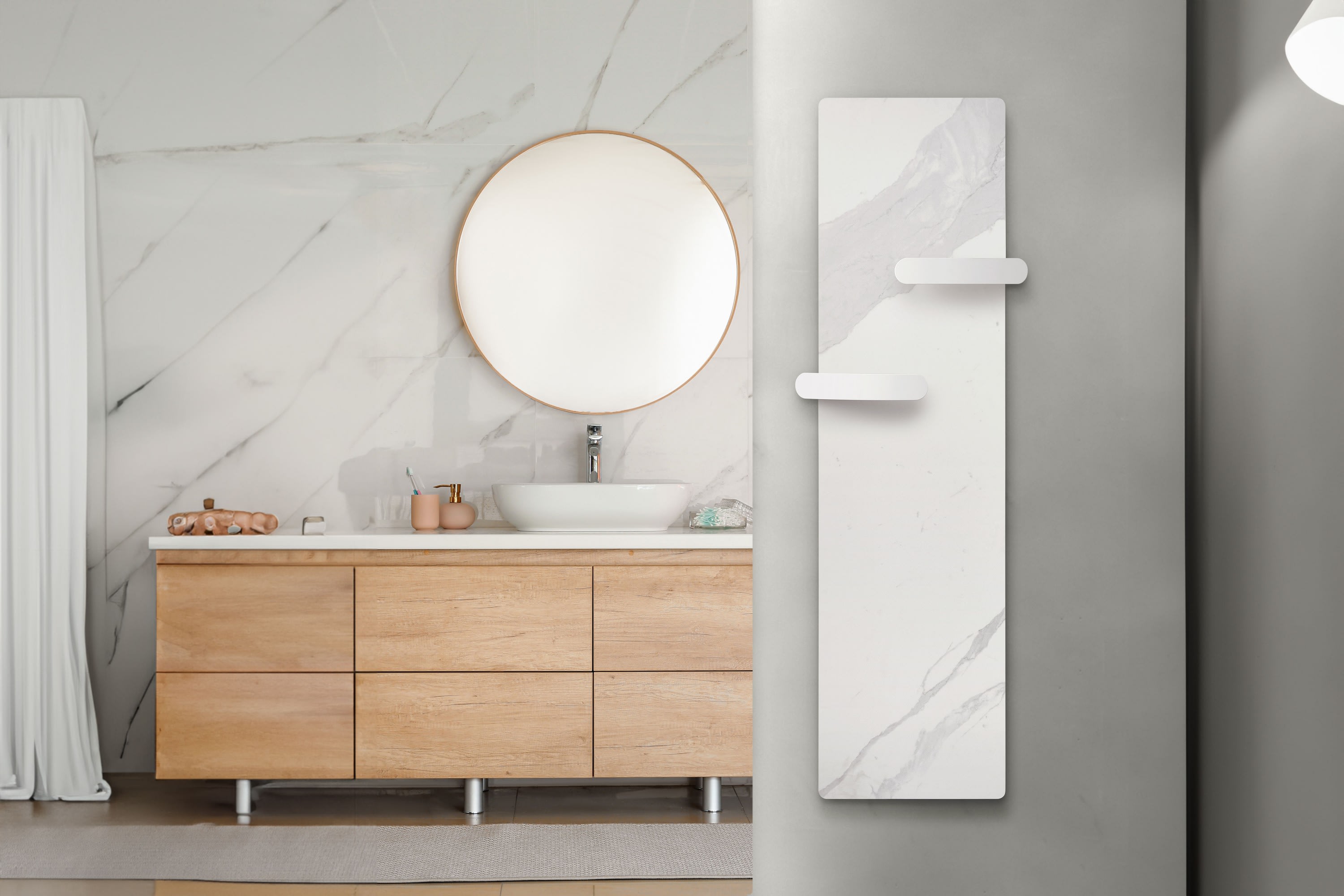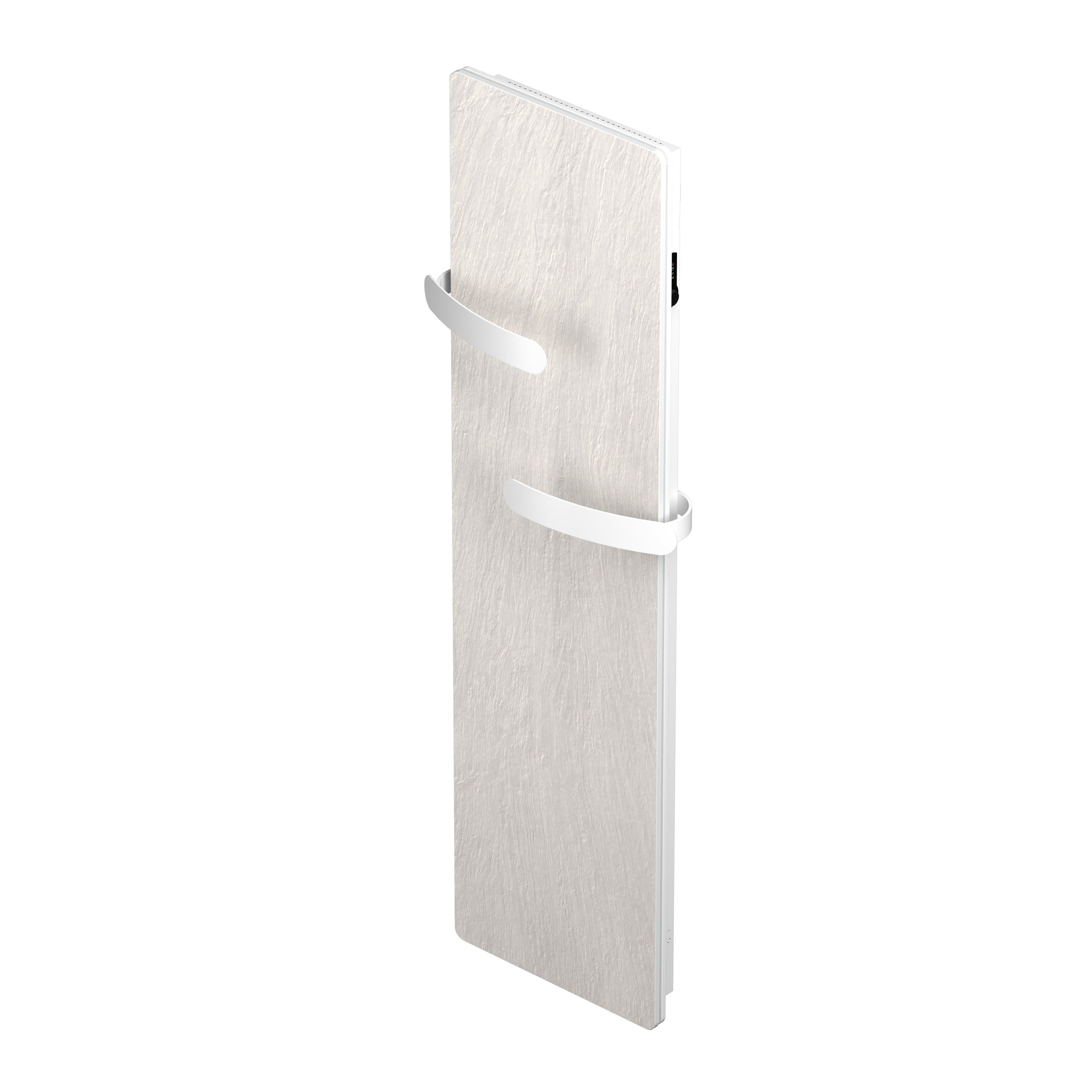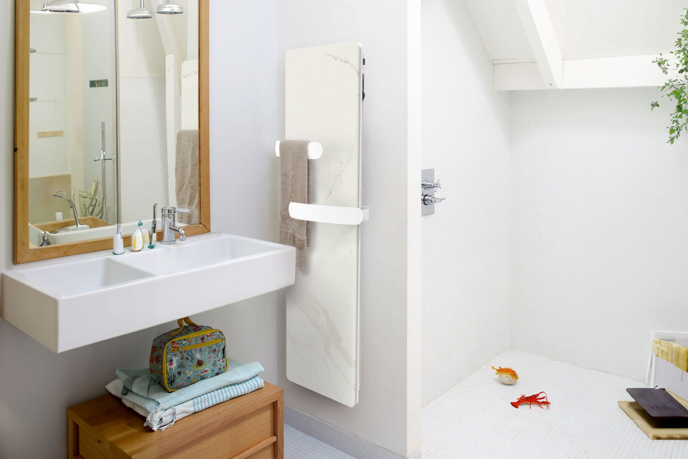 KERAMOS nativ* en version salle de bains, équipé de 2 barres de séchage et fonctions de réglage spéciales "séchage". Pour les grandes salles de bains pièces à vivre qui ont besoin d'un véritable radiateur et de fonctionnalités de séchage. Une proportion idéale pour ce modèle vertical : 1,65 m de hauteur pour une faible largeur de 45 cm , propose une élégante et confortable surface d'échange et de séchage sans encombrer l'espace. Les 3 finitions décoratives présentent une exceptionnelle résistance à l'usure et à l"humidité.Terre de mars, un effet rouillé oxydé. Marbre blanc qui reprend les veinages du véritable marbre. Blanc ardoise un blanc très structuré. Nouvelle interface de réglage nativ avec son écran graphique couleur, sa connectivité** simplifiée et ses nouvelles fonctions d'économies d'énergie. A noter la fonction d'auto-effacement des heures de pointes pour un usage responsable de l'électricité.*