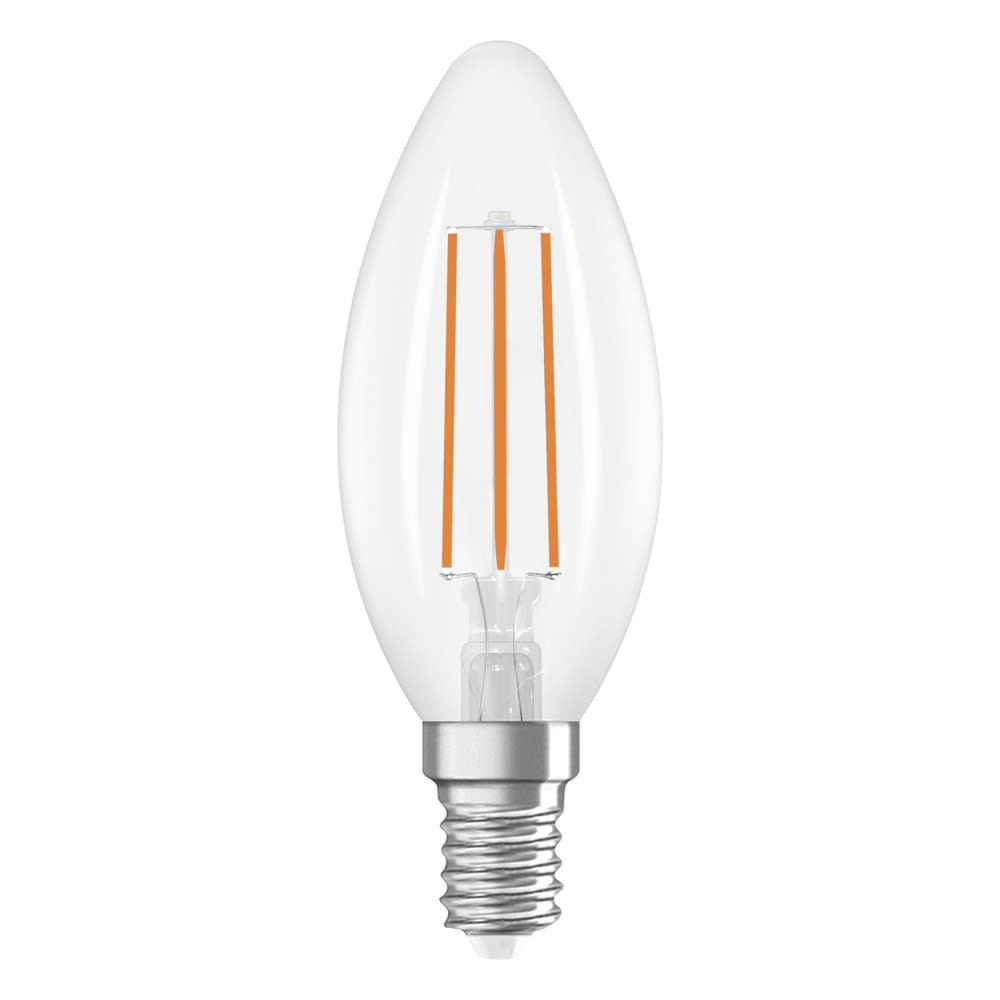 Lampes LED, forme de bougie classique, CLASSE D'EFFICACITÉ ÉNERGÉTIQUE A. Caractéristiques du produit: Lampes LED disponibles pour tension secteur. Efficacité lumineuse : jusqu'à 210 lm/W. Ouverture du faisceau : jusqu'à 300°. Très longue durée de vie allant jusqu'à 30 000 heures. Nombre de cycles de commutation extrêmement élevé 500 000. Avantages du produit: Lampes avec technologie de « filament » LED innovante. Faible consommation d'énergie. Conception, dimensions, flux lumineux comparables à une lampe halogène. Allumage instantané. Effets de scintillement et stroboscopiques réduits. Zones d'application: Idéal pour les installations décoratives. Applications domestiques. Éclairage général. Utilisation en extérieur uniquement dans des luminaires d'extérieur appropriés. Conseils de sécurité: Ne touchez pas la lampe si elle est cassée.. Ne doit pas être utilisé si l'ampoule extérieure est défectueuse..