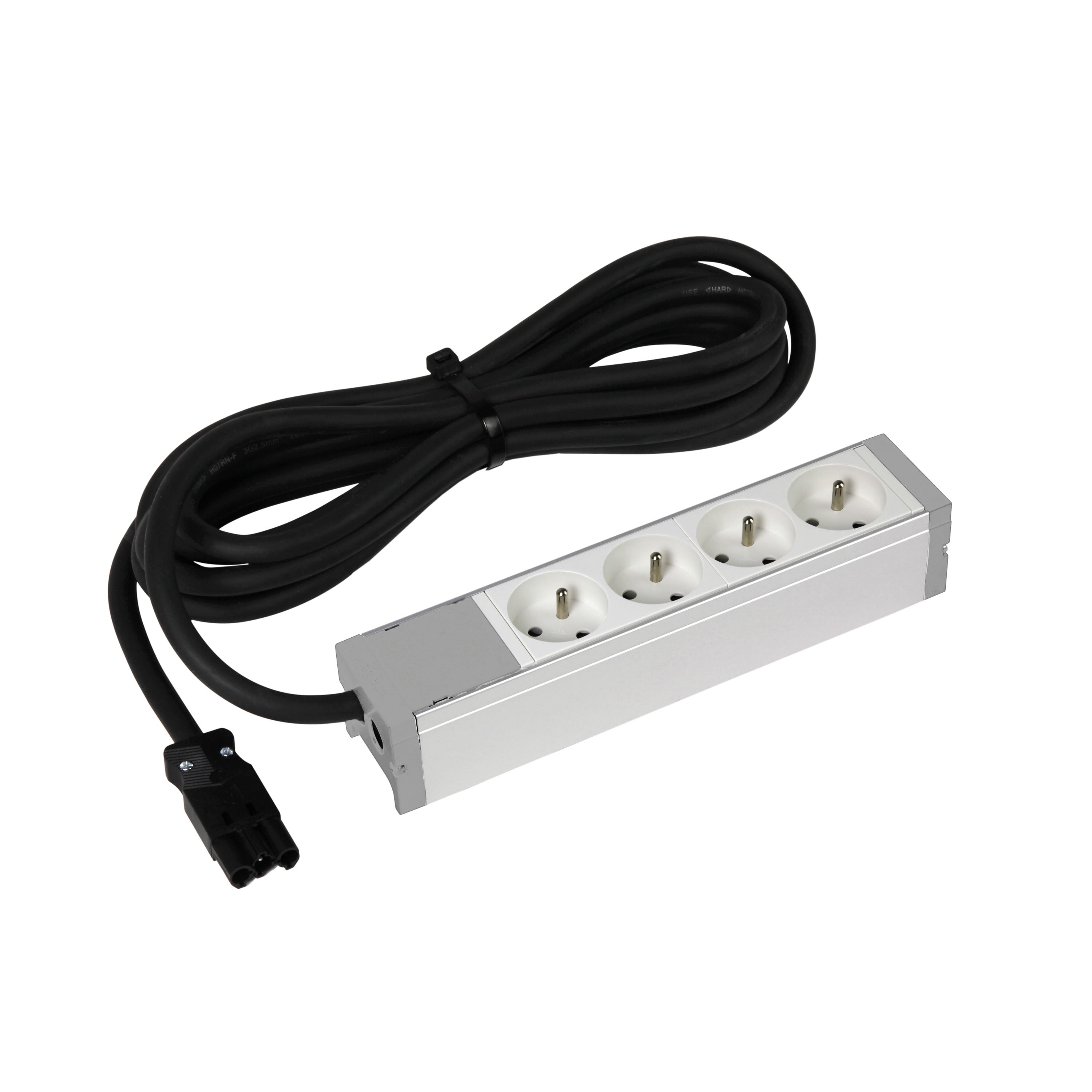 Bloc nourrice avec cuve en aluminium, câblé et équipé d'un cordon 5m H07 RNF 3G 2,5mm² muni d'un connecteur mâle à raccordement rapide (1 cordon par type de courant) Equipé de 4 prises 2P+T avec puits inclinés à 35° - 16A - 250V~ équipées d'éclips de protection - Puissance maximum : 3680W en 230V Puissance maximum : 3680W en 230V Dimensions :- longueur : 247mm- largeur : 52mm- hauteur : 52,5mm IP20 - IK07 - Conforme à la norme NF C 61-314
