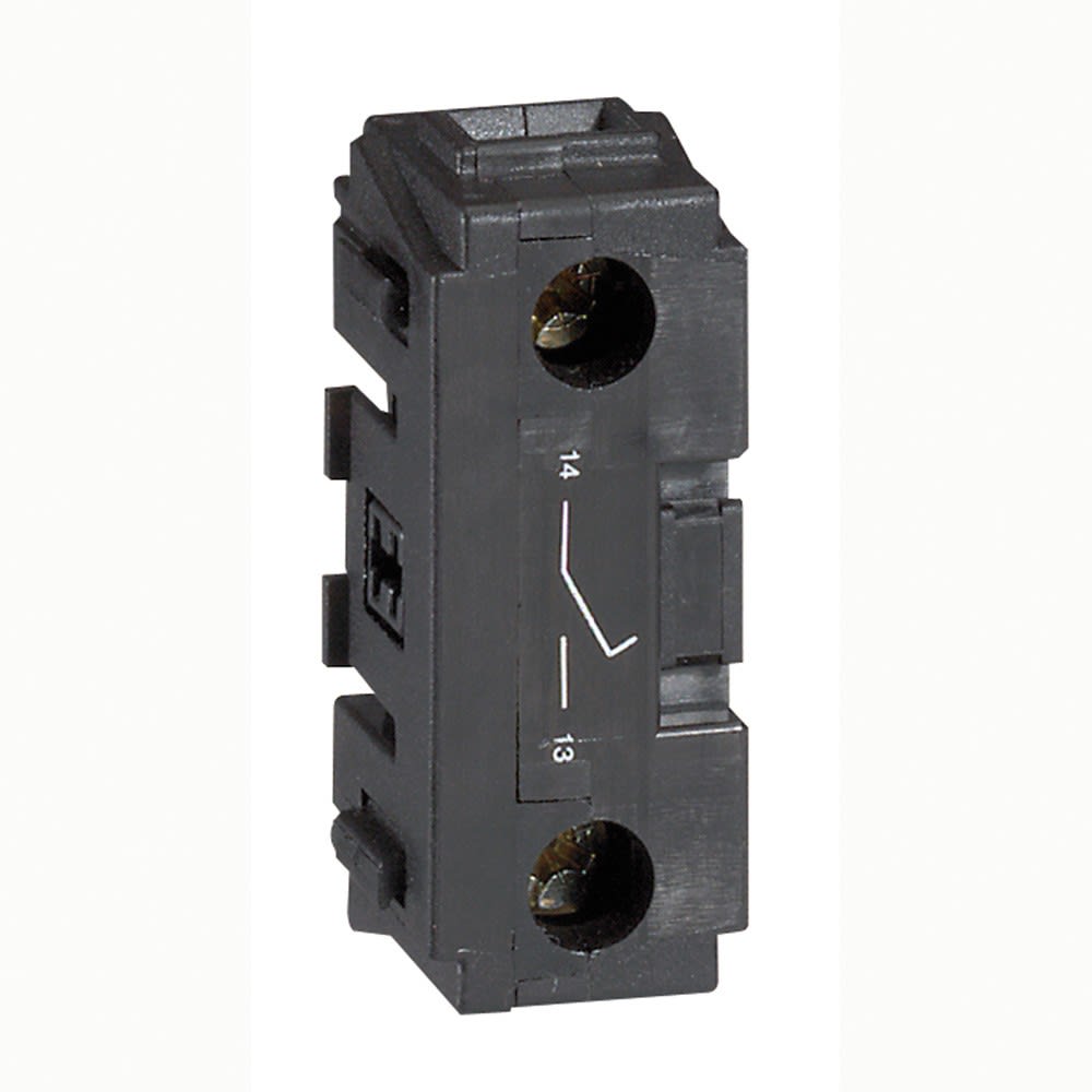 Contact auxiliaire de précoupure pour interrupteur sectionneur rotatif composable 20A à 32A - Pour télécommander un dispositif externe de coupure à manque de tension Composant réversible en vue d'une application sur panneau ou sur rail symétrique Conforme à la norme IEC EN 60947-3