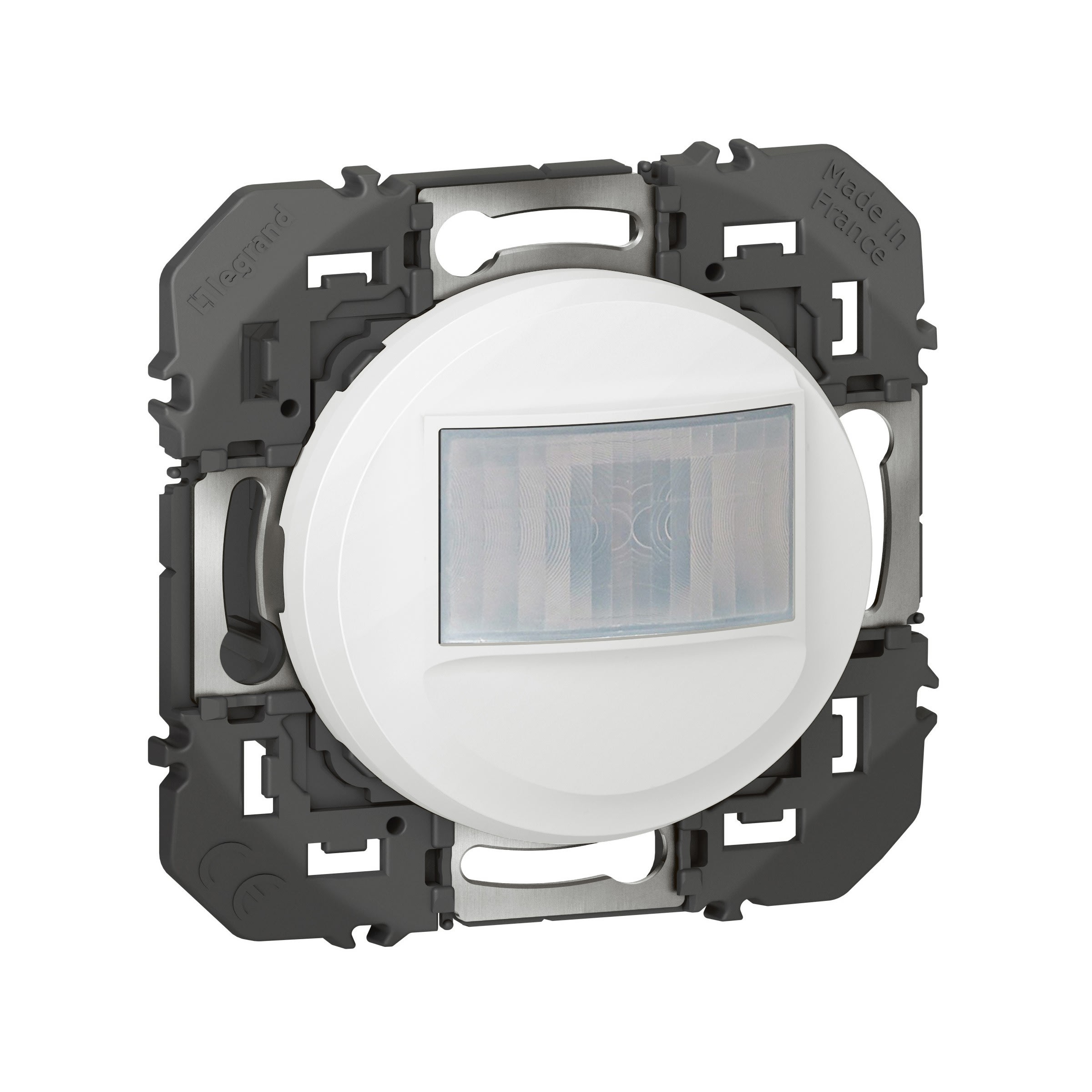 Détecteur de mouvement avec ou sans dérogation, câblage 3 fils avec Neutre dooxie finition blanc - À équiper d'une plaque Permet la commande de lampes :- 500W LEDs/fluocompact - 2000W Halogène - 1000VA LEDs, CFLs, Halogène, tube fluo avec ballast ferromagnétique ou électronique Compatible avec boîte d'encastrement profondeur 40mm Livré avec coque de protection chantier à charnières : protège le produit de la poussière et des éclaboussures de peinture et permet au mécanisme de rester utilisable pendant le chantier