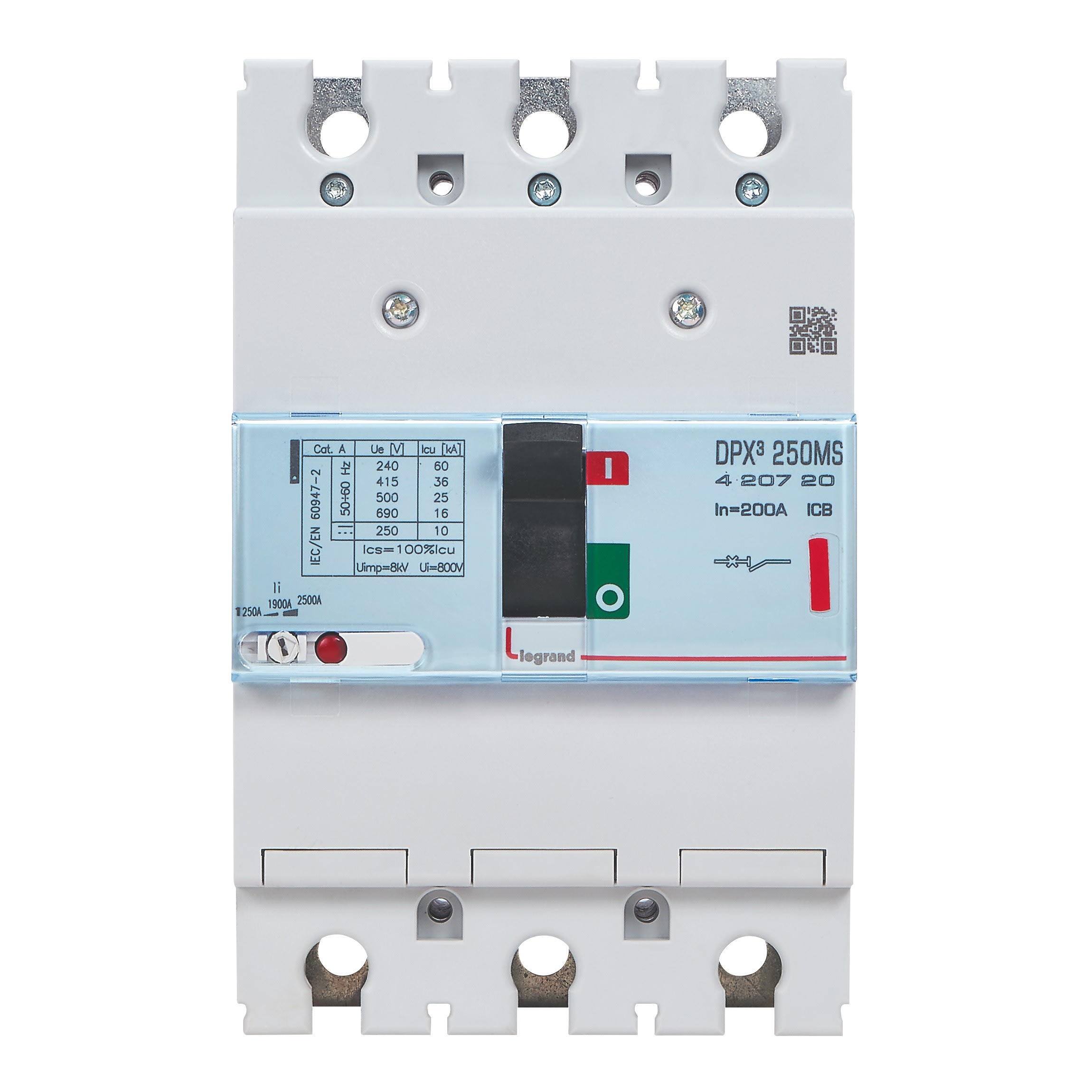 Disjoncteur DPX³250 magnétique seul - 3P - In : 200A Pouvoir de coupure Icu - 36kA (400V~) - Magnétique réglable Livré avec bornes à cage, raccordement 95mm² maximum en câble souple et jusqu'à 120mm² avec accessoire Reçoit les auxiliaires de signalisation et de commande des DPX³ Conforme à la norme NF IEC 60947-2