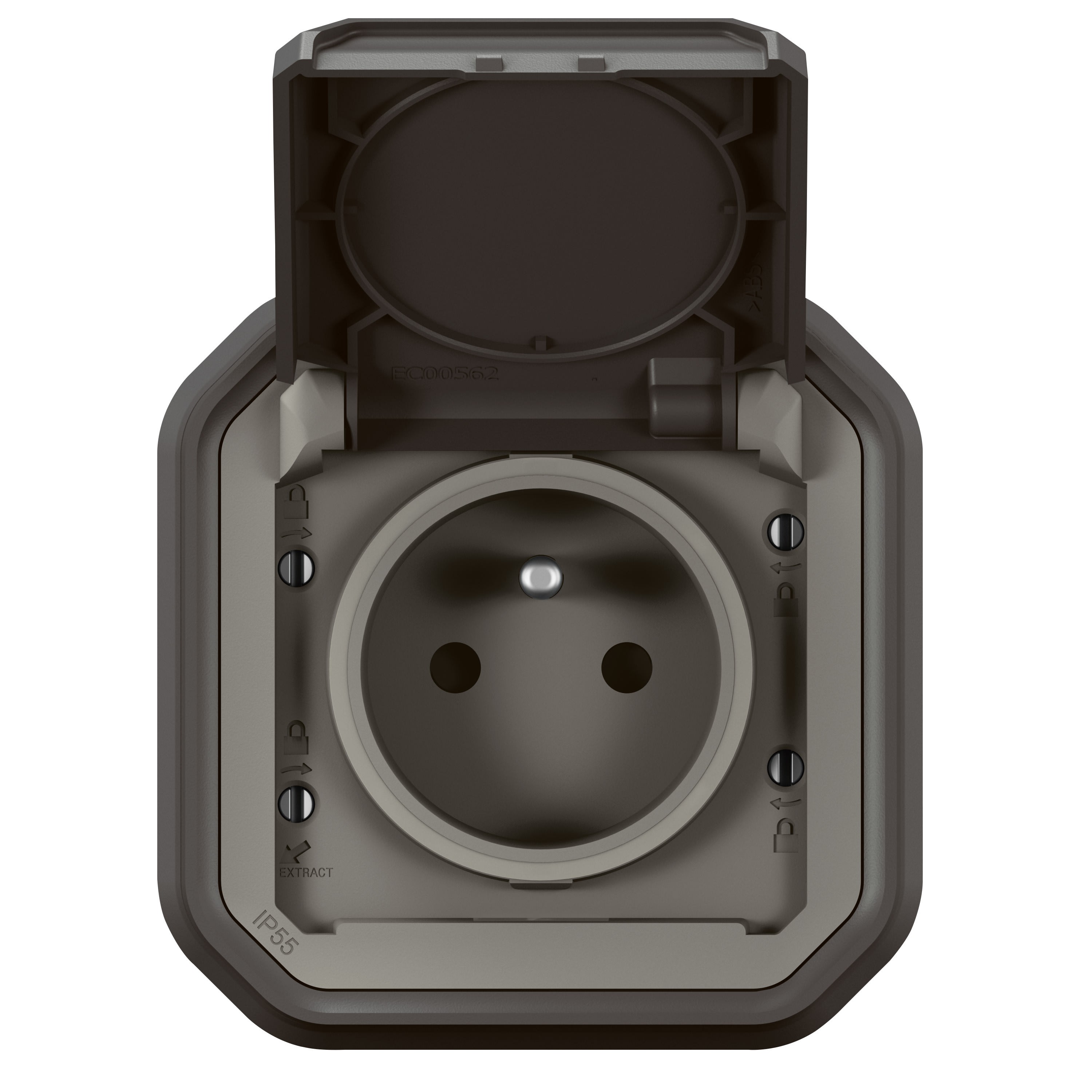 Prise de courant 2P+T étanche Plexo 16A 250V IP55 IK08 livrée complète avec support plaque pour fixation en encastré - anthracite