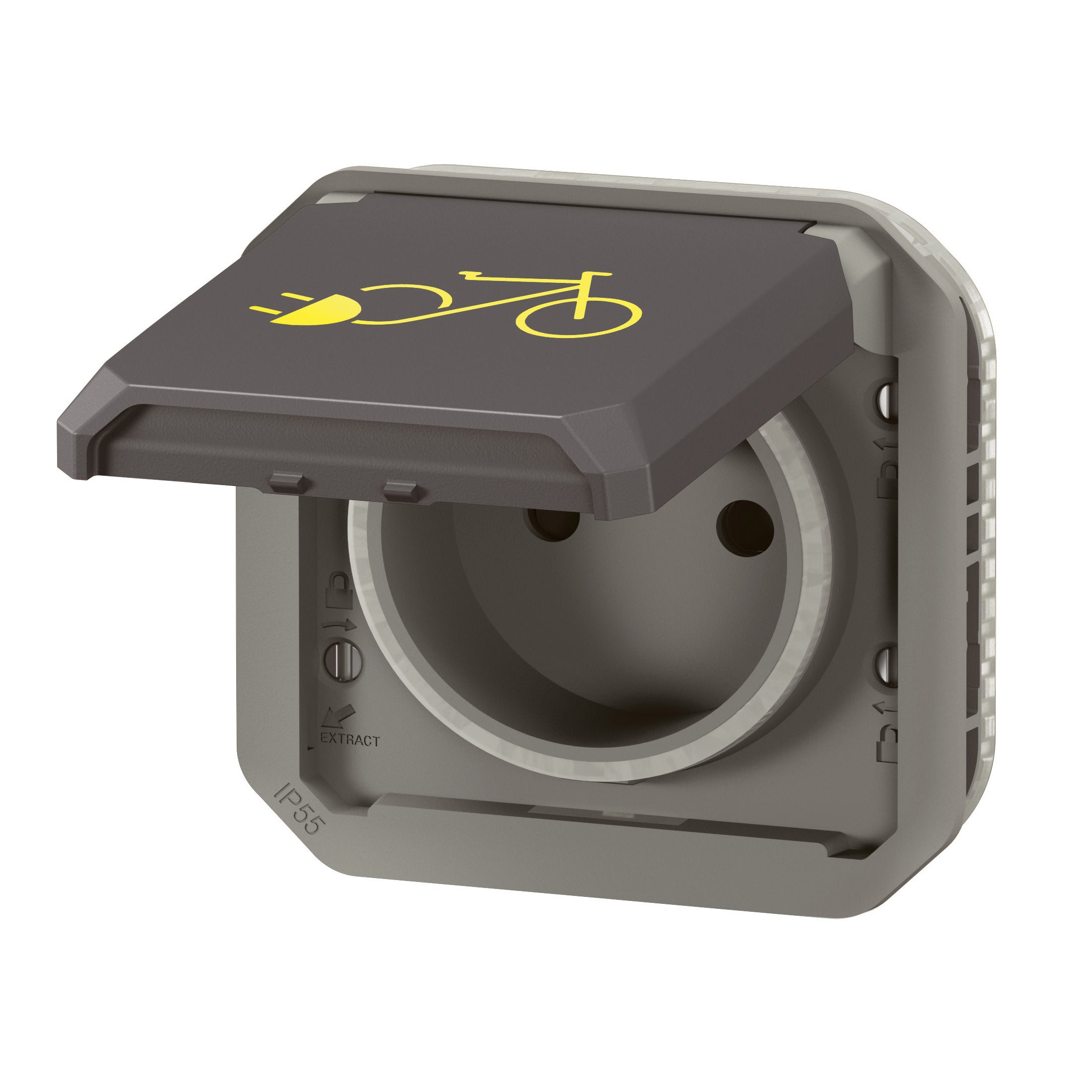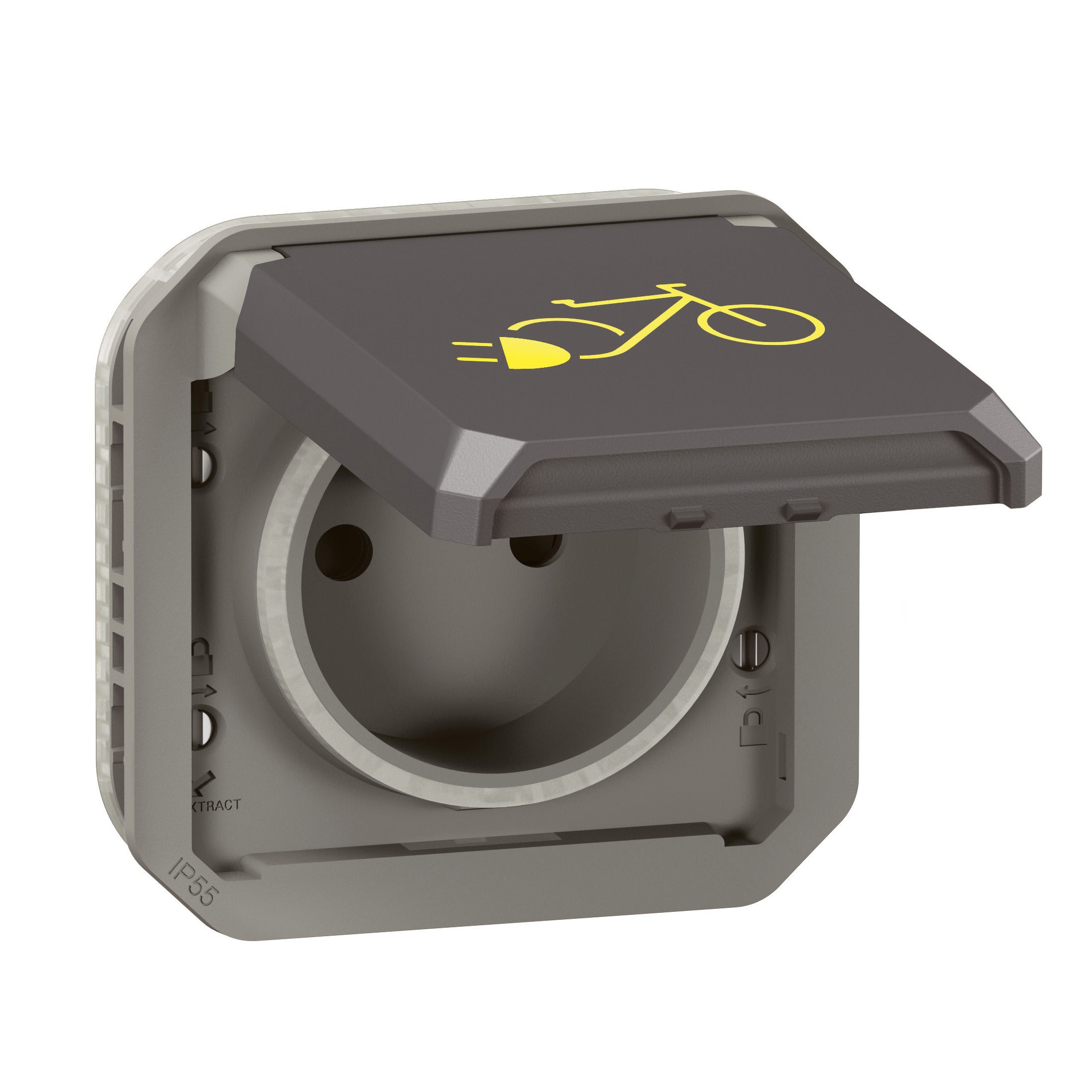 Prise de courant 2P+T 16A 250V - Connexion rapide sans outil avec repérage couleur Produit à compléter soit avec un boitier saillie, soit avec un support encastré IP55 : protégé contre les poussières et les projections d'eau à la lance de toutes directions IK08 : résistance à un choc de 5 joules Pictogramme 2 roues électriques présent sur la face avant du produit
