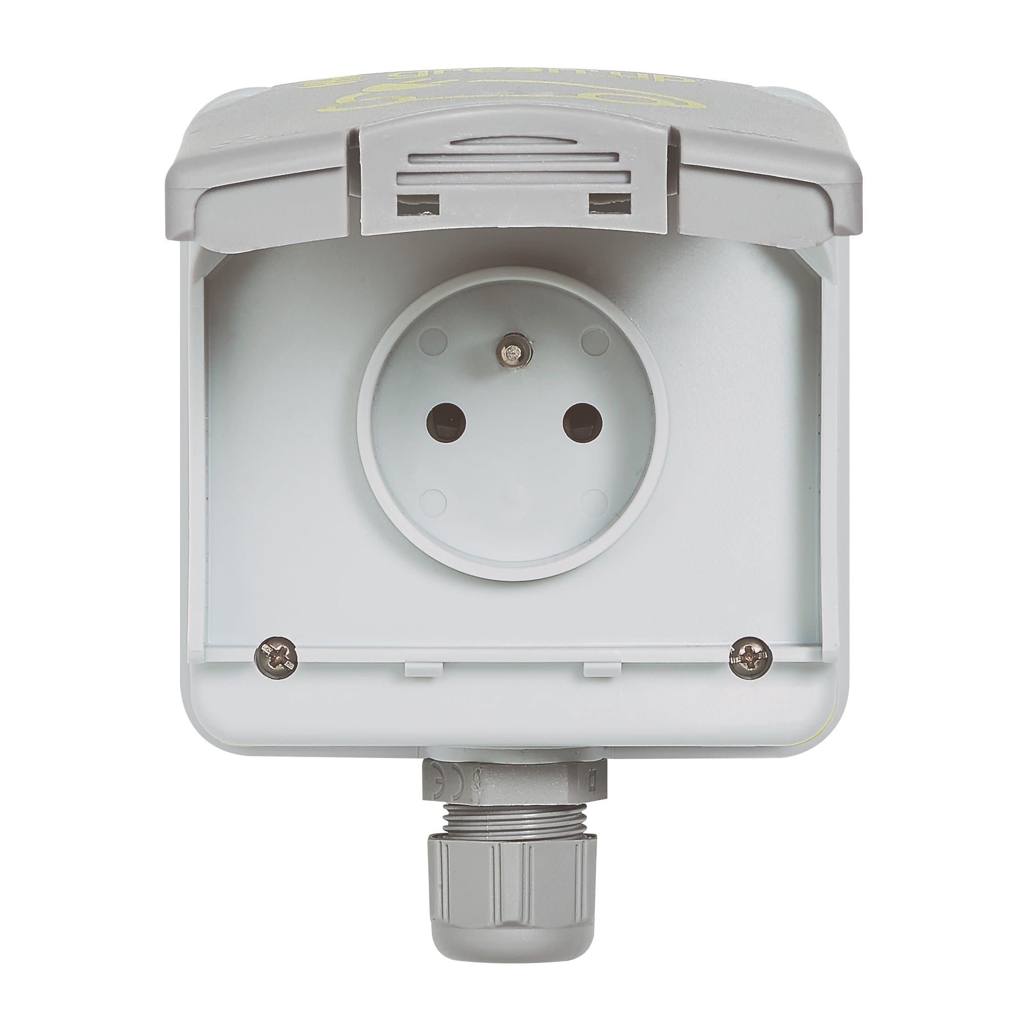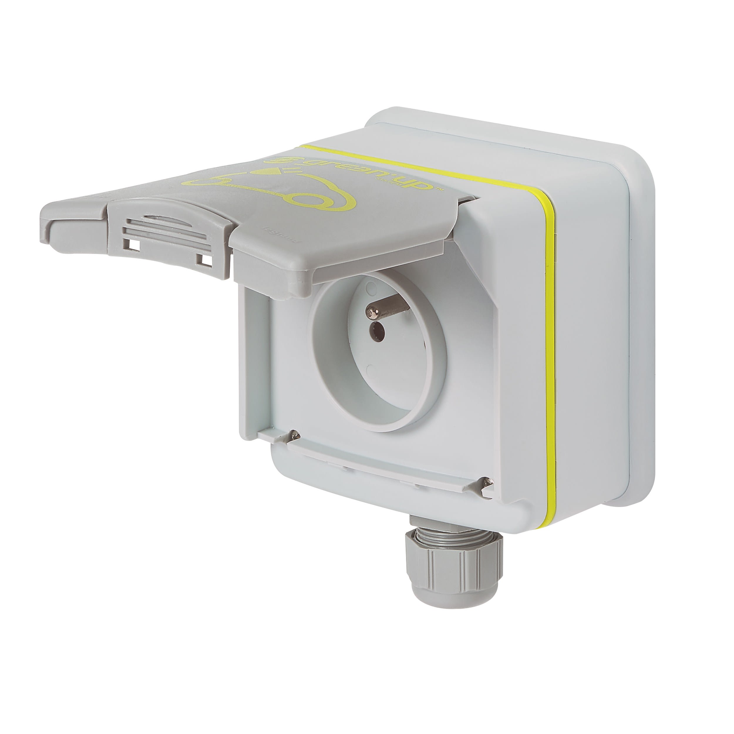 Prise Green'up Access avec volet monophasée 230V IP66 - IK08 - 16A - 230V - 16A VE - Livrée avec boîtier saillie équipé d'un presse-étoupe ISO20 et patère Dimensions (hors PE) :- hauteur 98mm- largeur 98mm- profondeur 70mm Raccordement à vis à partir du tableau électrique par 1 ligne dédiée 3 x 2,5mm² (1 ligne par borne) avec protection par :- disjoncteurs différentiels dédiés référence 410754 ou 410856- 20A- courbe C- 30mA- typeF (ex Hpi) ou interrupteur différentiel 30mA- typeF (ex Hpi) + disjoncteur 20A- courbe C Convient pour une installation dans les lieux de vie type maison individuelle Certifiée NF, conforme aux normes NF C 61-314 et IEC 60-884-1