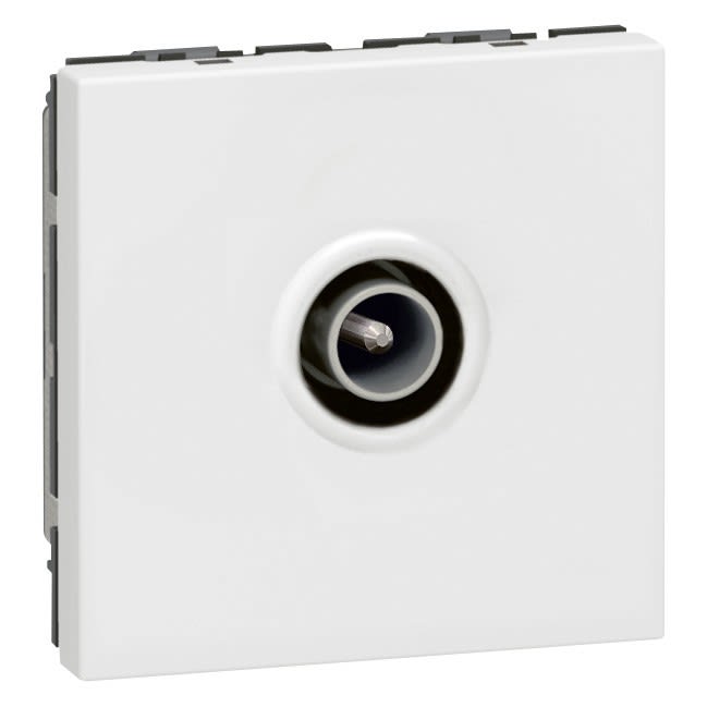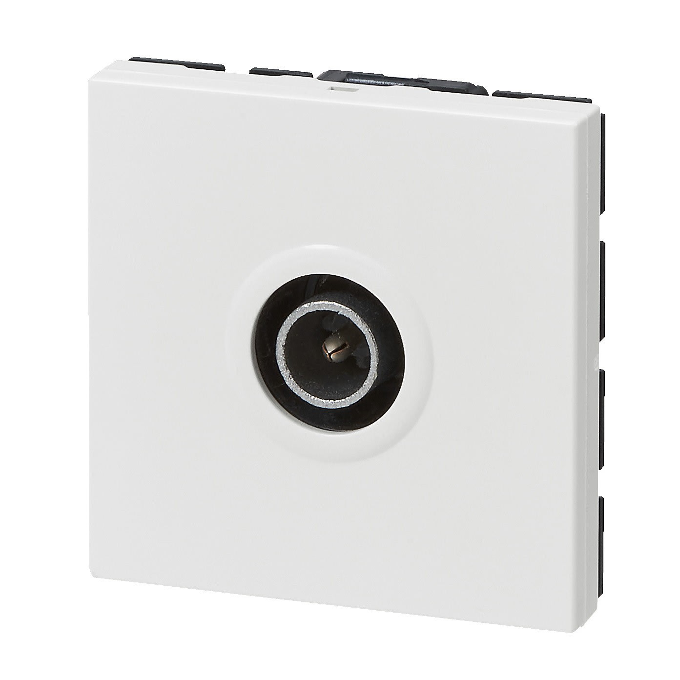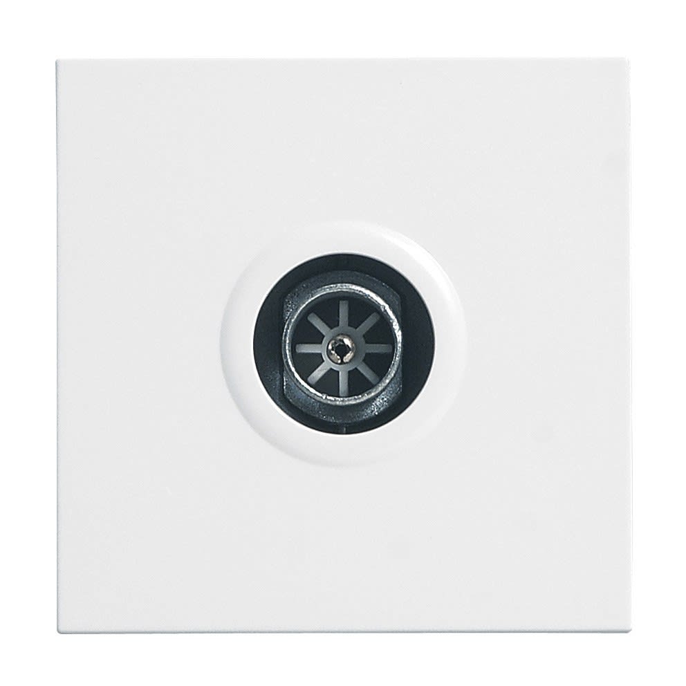 Reçoit les fiches TV femelle 9,52 mm Câblage avec câble coaxial Ø 5,5 à 7 mm - 75Ω Blanc Limite l'affaiblisement de signal (atténuation inférieure à 1,5 dB) A équiper d'une plaque de finition Mosaic