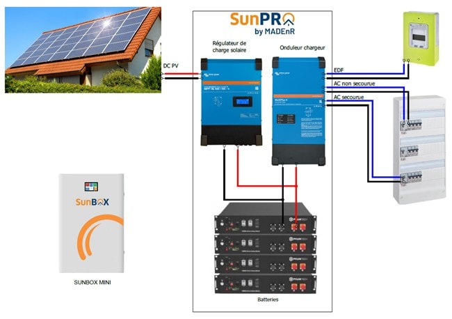 Systèmes hybrides intégrant un onduleur pour installations photovoltaïques nouvelles ou existantes. Solutions pour stocker le surplus d’énergie électrique produite afin de l’utiliser le soir, la nuit ou le jour au lieu de l’envoyer dans le réseau, ce qui permet de maximiser l’autoconsommation et l’indépendance énergétique. Systèmes intégrés « all-in-one » dont tous les éléments sont contenus dans un seul boîtier élégant. Batteries au Lithium-Fer-Phosphate (LiFePO4) modulable de 2,4 à 14,4 kWh avec des puissances livrables de 3 à 10 kVAC. Alimentation même en cas de black-out (instantanée pour les SunMini et SunBox ou moins de 2 s pour les SunWall) et continuité de la production photovoltaïque. Système de monitoring gratuit. Conformes UTE C15-712-1/2/3 VDE0126 et EN/IEC 61427. Garantie constructeur de 8 ans, extensible à 12 ans, batteries incluses. Veillez à installer votre équipement : Dans un endroit sec, couvert, non inondable, non potentiellement explosif, à l’abri des rongeurs, loin des matières inflammables Pas directement au soleil À bonne distance des murs pour une bonne ventilation (cf. notice d'installation suivant modèle) Sur une surface capable de supporter le poids de l’équipement Sur un plan vertical avec une inclinaison maximale de 5° pour les modèles qui se montent au mur.