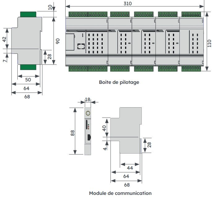 Ce kit est constitué de 3 éléments à fixer sur rail DIN (bloc commande d'abaissement et d'effacement permettant de donner 24 consignes différentes, module de communication, module de programmation) livré avec accessoires.