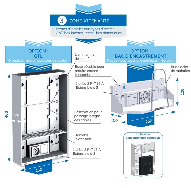 La zone attenante NEO permet d'installer proche du tableau de communication tous les types d'actifs (box, ONT, box domotique...)