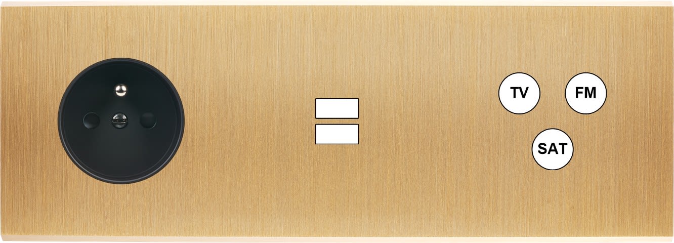 Façade Confidence en laiton massif finition Brossé triple horizontale prise de courant 2P+T ouverture pour chargeur double USB 1 TV-FM-SAT