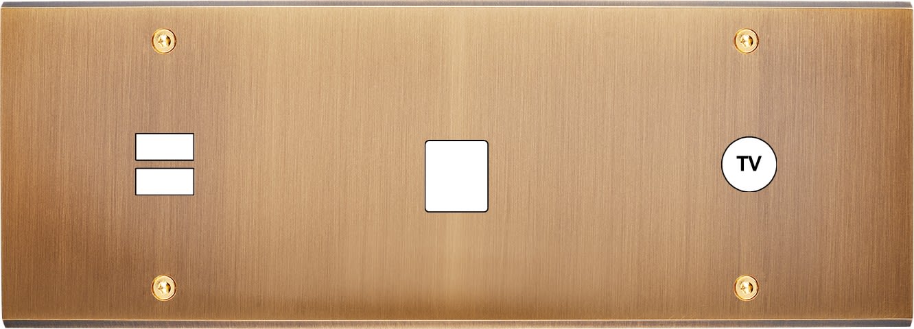 Façade Confidence en laiton massif finition Vieux Bronze triple horizontale ouverture pour chargeur double USB 1 média 1 TV. Façade à vis. Dimensions 222x80x5mm. Fabriqué en France.