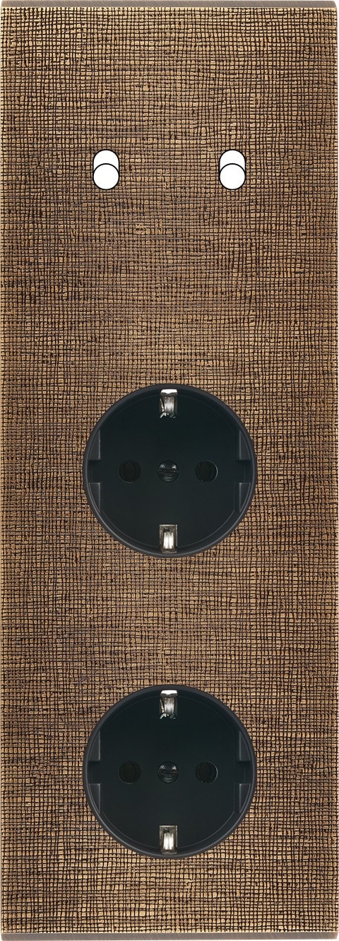 Façade Fascination en laiton massif finition Coslan triple verticale 2 Basculeurs 1 prise Schuko 1 prise Schuko. Dimensions : 80x222x5mm, deux chanfreins biseautés. Fabriqué en France, dans les ateliers de Steaven Richard.