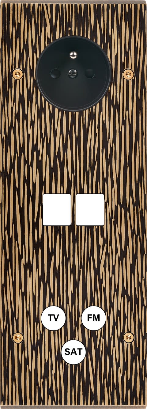 Façade Fascination en laiton massif finition Fauve triple verticale prise de courant 2P+T 2 média 1 TV-FM-SAT à vis. Dimensions : 80x222x5mm, deux chanfreins biseautés. Fabriqué en France, dans les ateliers de Steaven Richard.