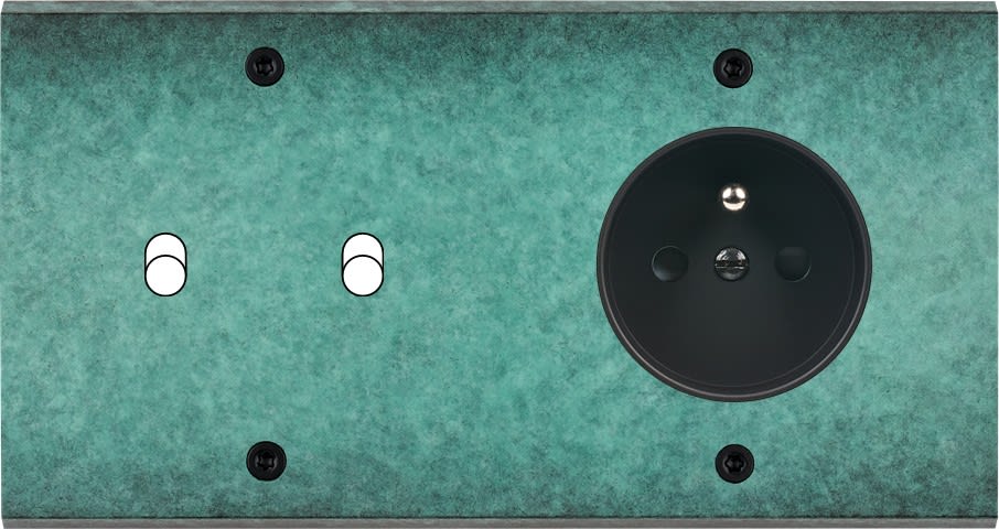 Façade Fascination en laiton massif finition Jade double horizontale 2 basculeurs prise de courant 2P+T à vis. Dimensions : 151x80x5mm, deux chanfreins biseautés. Fabriqué en France, dans les ateliers de Steaven Richard.