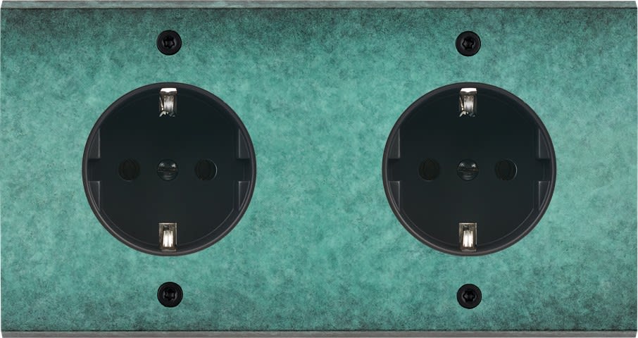 Façade Fascination en laiton massif finition Jade double horizontale 1 prise Schuko 1 prise Schuko à vis. Dimensions : 80x80x5mm, deux chanfreins biseautés. Fabriqué en France, dans les ateliers de Steaven Richard.