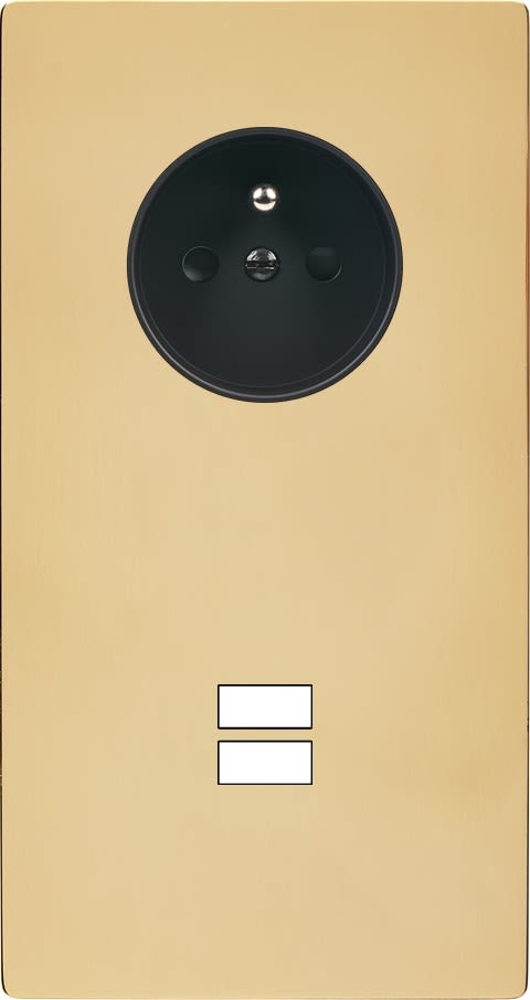 Façade "M" Laiton Miroir double verticale, 1 prise de courant 2P+T /1 chargeur USB. Façade magnétique. Fabriquée en France. Sur cette finition, le laiton n'est pas verni, pour qu'il se patine avec le temps.