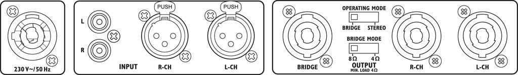 - LEDs pour Power, Signal, Bridge, écrêtage (CLIP), surchauffe et protection