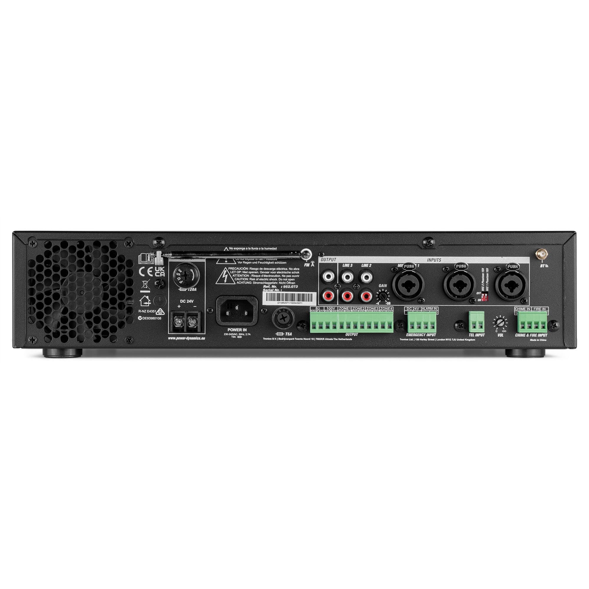 La série PDV est une gamme d'amplificateurs mixeurs haute puissance entièrement équipés avec 4 sorties de zone, chacune avec des réglages de volume distincts à 6 niveaux. Cette série d'amplificateurs dispose d'un module MP3 intégré avec port USB et insert carte SD, d'un tuner FM et d'un récepteur BT interne. Le canal Mic 1 a priorité sur toutes les entrées et le lecteur MP3. Des contacts 24V peuvent être connectés à un panneau d'alarme incendie pour l'évacuation d'urgence si nécessaire. Tous les modèles sont conçus avec une protection complète contre les surcharges pour éviter tout dommage. Cette série d'amplificateurs convient aux applications dans une banque, une mairie, un supermarché, une école, un hôtel, un restaurant, un centre commercial ou tout autre espace public.