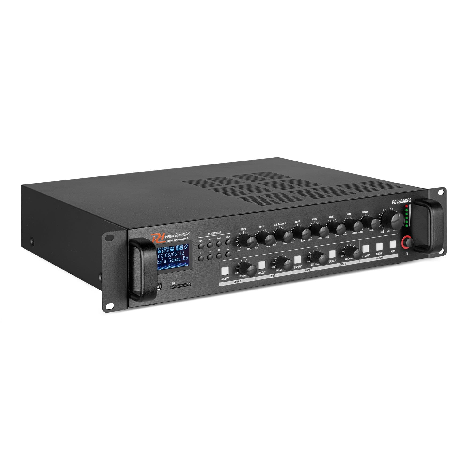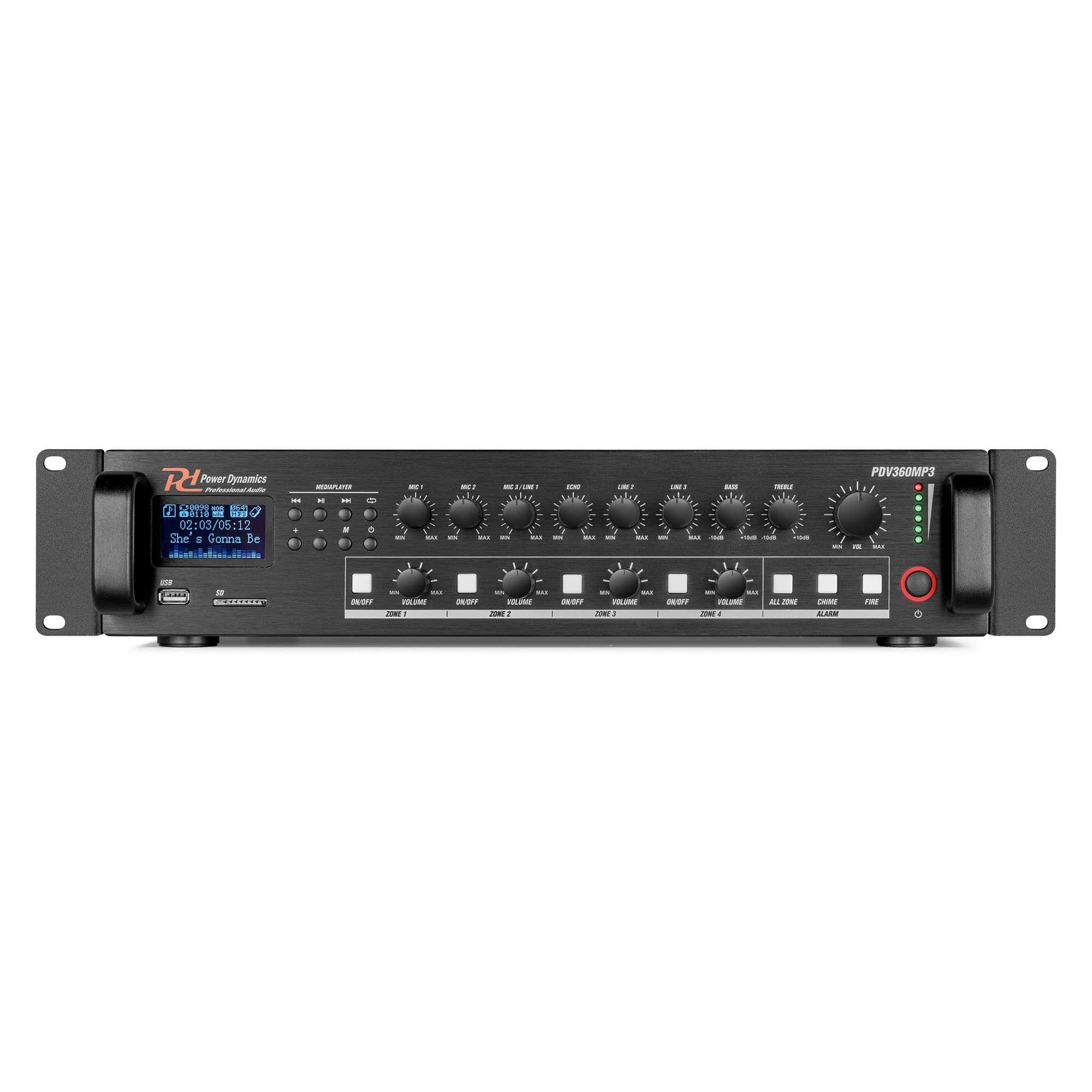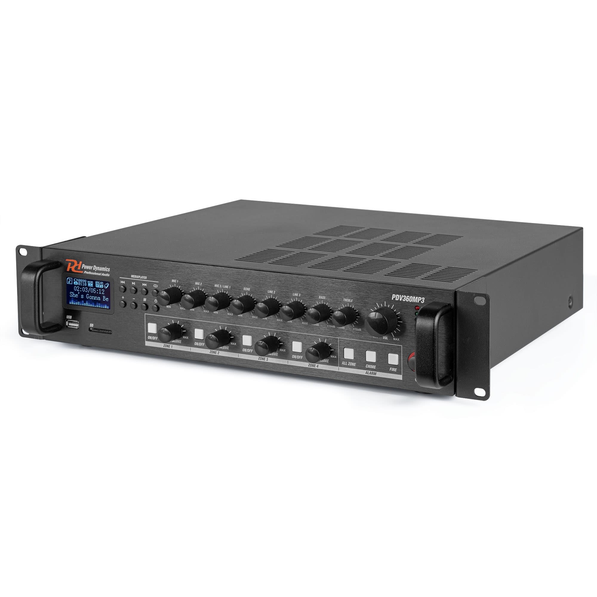 Amplificateur Public adress, 360 W, 100 V, 8 Ω, mixeur, 4 zones, lecteur multimédia / BT / FM - PDV360MP3