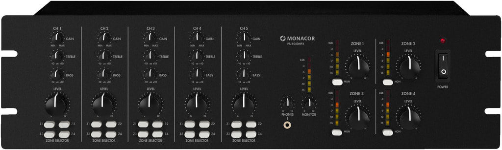 Monacor - Table de mixage Public adress, 4 zones, 4 canaux - PA-4040MPX