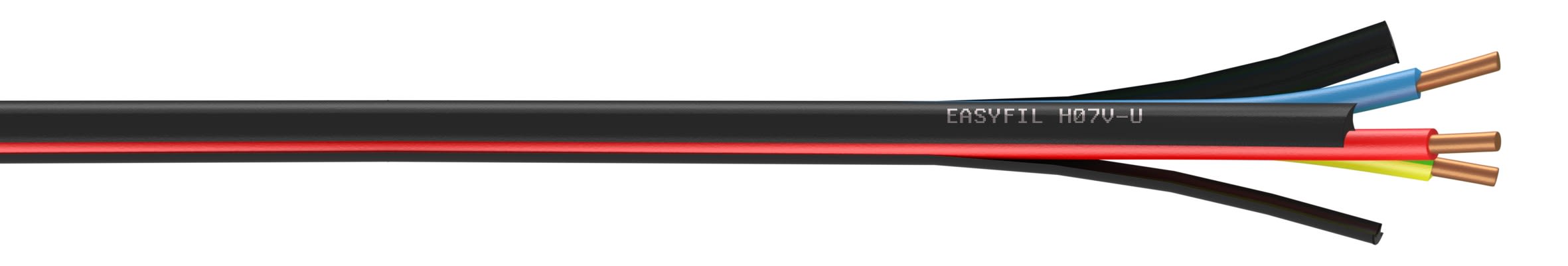 Les 3 Fils Nexans HO7V-U Easyfil pour les sections 1.5 et 2.5mm² mm sont préassemblés grâce à un liant pelable. Easyfil est idéal pour les passages dans les goulottes ou dans les plinthes et permet de gagner 50% du temps car il n’y a qu’un seul et unique élément à tirer, donc le risque d’emmêler les fils disparaît.