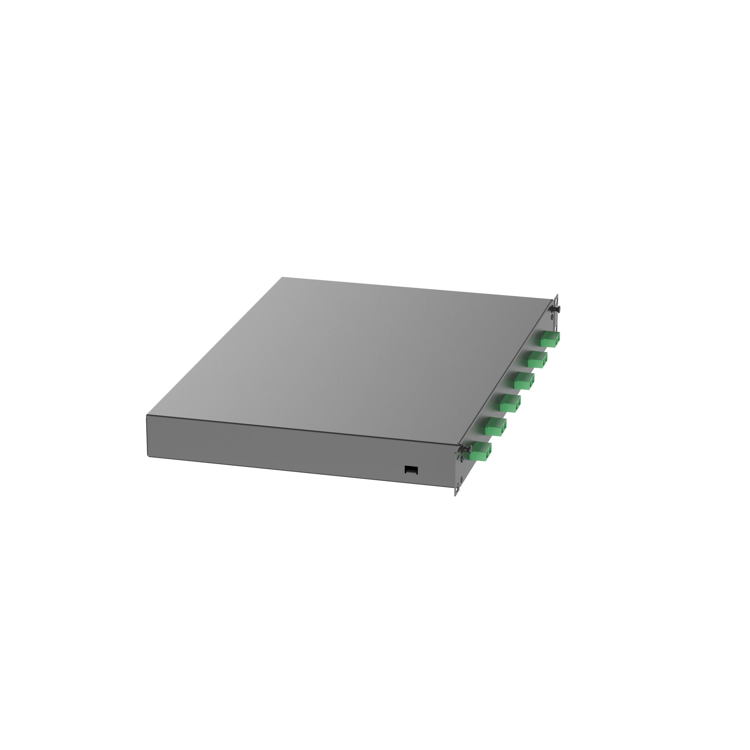 Le tiroir fibre est préchargé avec 6 adaptateurs SC Duplex APC de coloris vert avec gaines en zircone. Fabriqué en acier et revêtu de poudre noire. Dimensions : hauteur 44 mm x largeur 445 mm x profondeur 308 mm