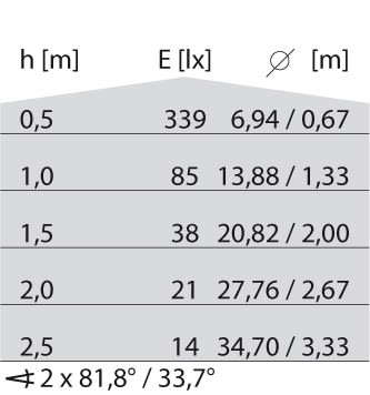 Appareil pour installation en applique, au plafond et sur poteaux, pour intérieur et extérieur, composé de: Boîtier et grille en aluminium moulé sous pression / Diffuseur en verre pressé et satiné à l’intérieur, solidaire avec le cercle / Joint en polymère expansé / Vis de fermeture en acier inox