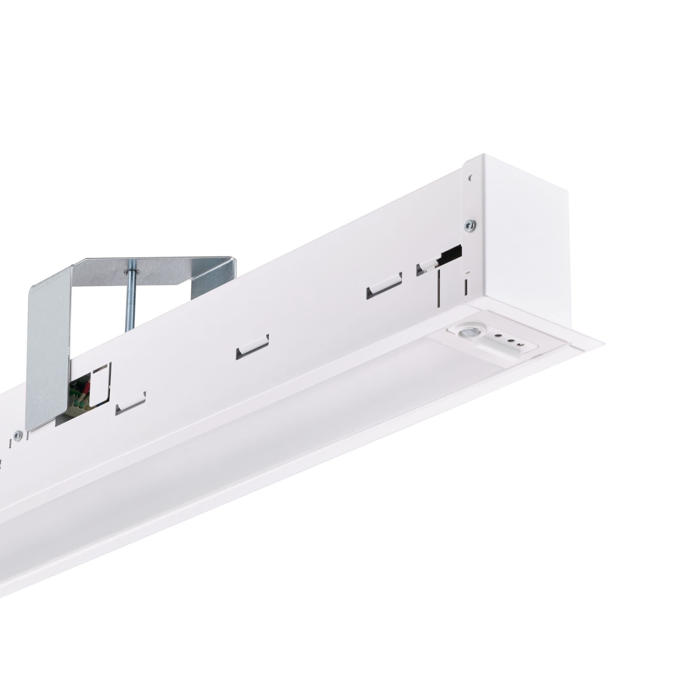 1200x80 mm, Visible profile ceiling version, Acier, Blanc, Blanc de sécurité (RAL9003), Système Interact Ready de pilotes Sensor Ready, Emplacement standard pour capteur avec capteur SNS210, 2500 lm, 27 W, 93 lm/W, Tunable white 2700-6500 K, (0.38, 0.38) SDCM 3, CRI90, Faisceau extensif, Opale, Polycarbonate, IP20/54 | Protection des doigts ; protection contre l’accumulation de poussière, protection contre les éclaboussures, IK03 | 0,35 J renforcé, Classe électrique I, Connecteur à poussoir 3 pôles