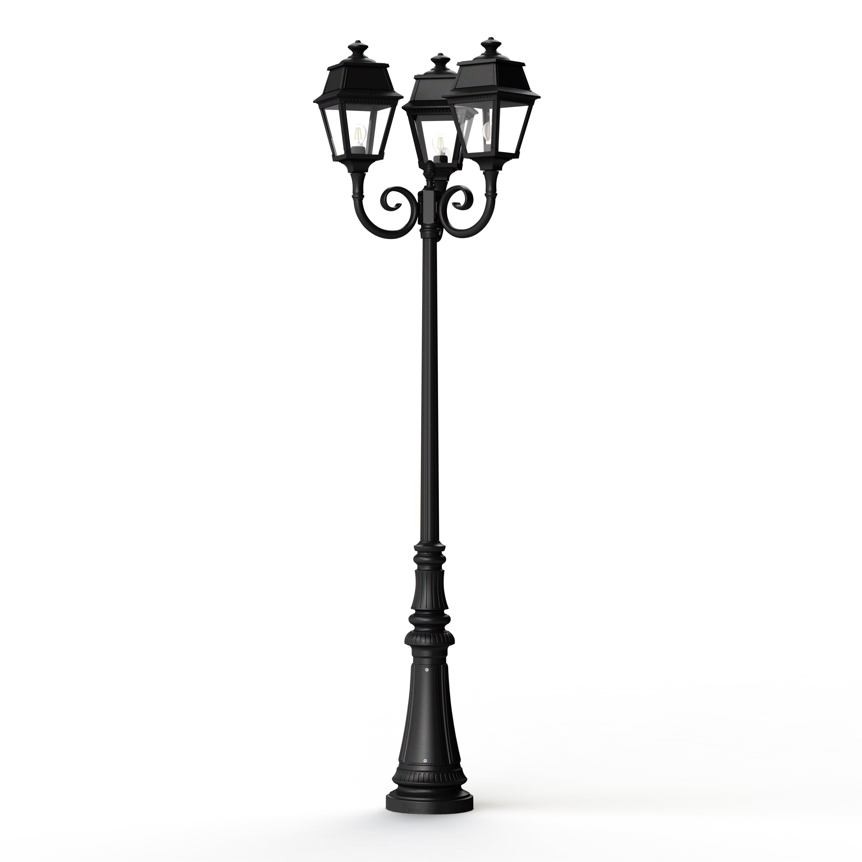 Lampadaire 3 têtes AVENUE 2 en aluminium, E27, IP44, classe 1, diffuseurs verre clair. Teinte RAL 9005 Noir foncé 000. Garantie 25 ans anticorrosion sur l'aluminium