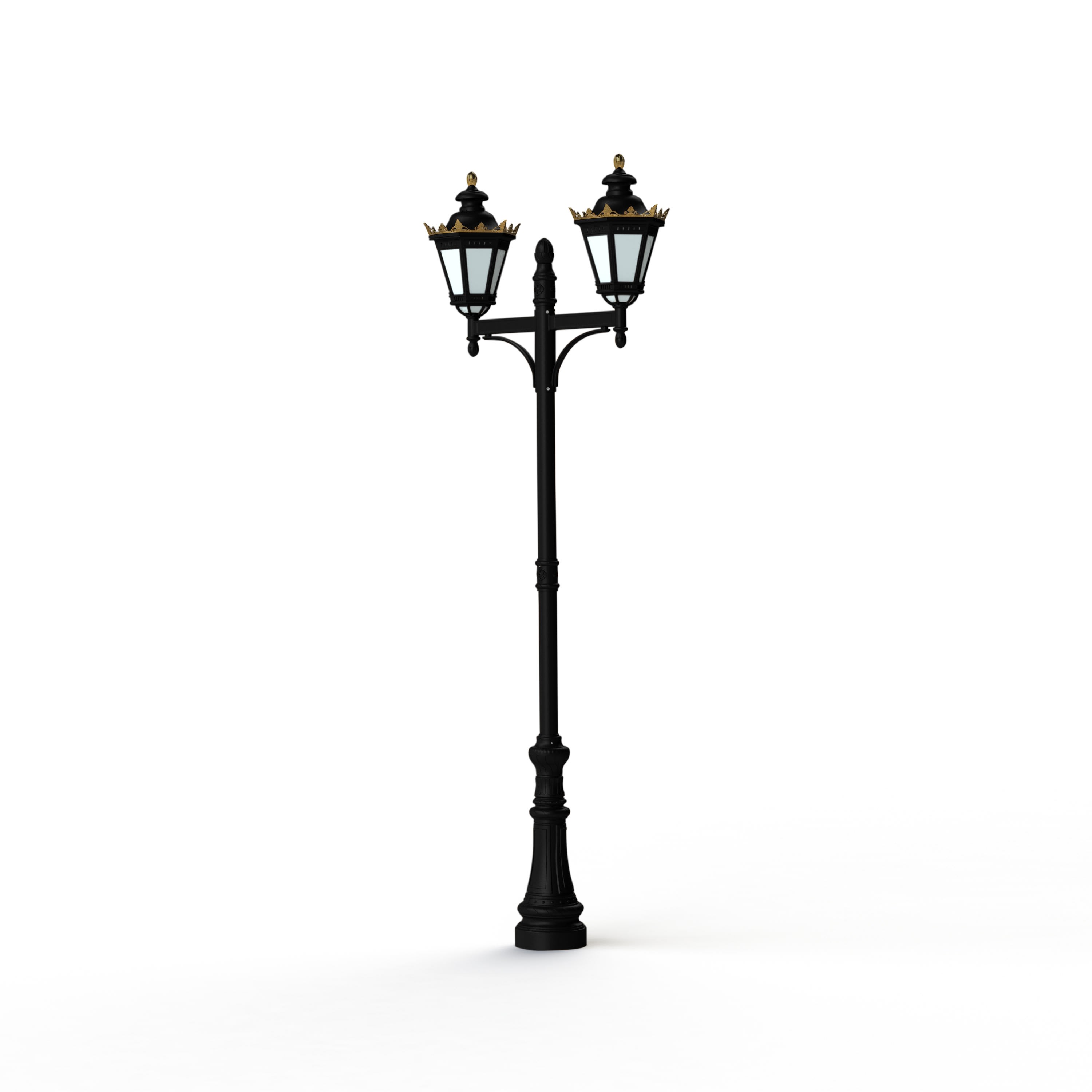 Lampadaire 2 têtes CITADELLE avec couronne, en aluminium, E27, IP66, classe 1, vasques méthacrylate opale. Teinte RAL 9005 Noir foncé 000. Garantie 25 ans anticorrosion sur l'aluminium