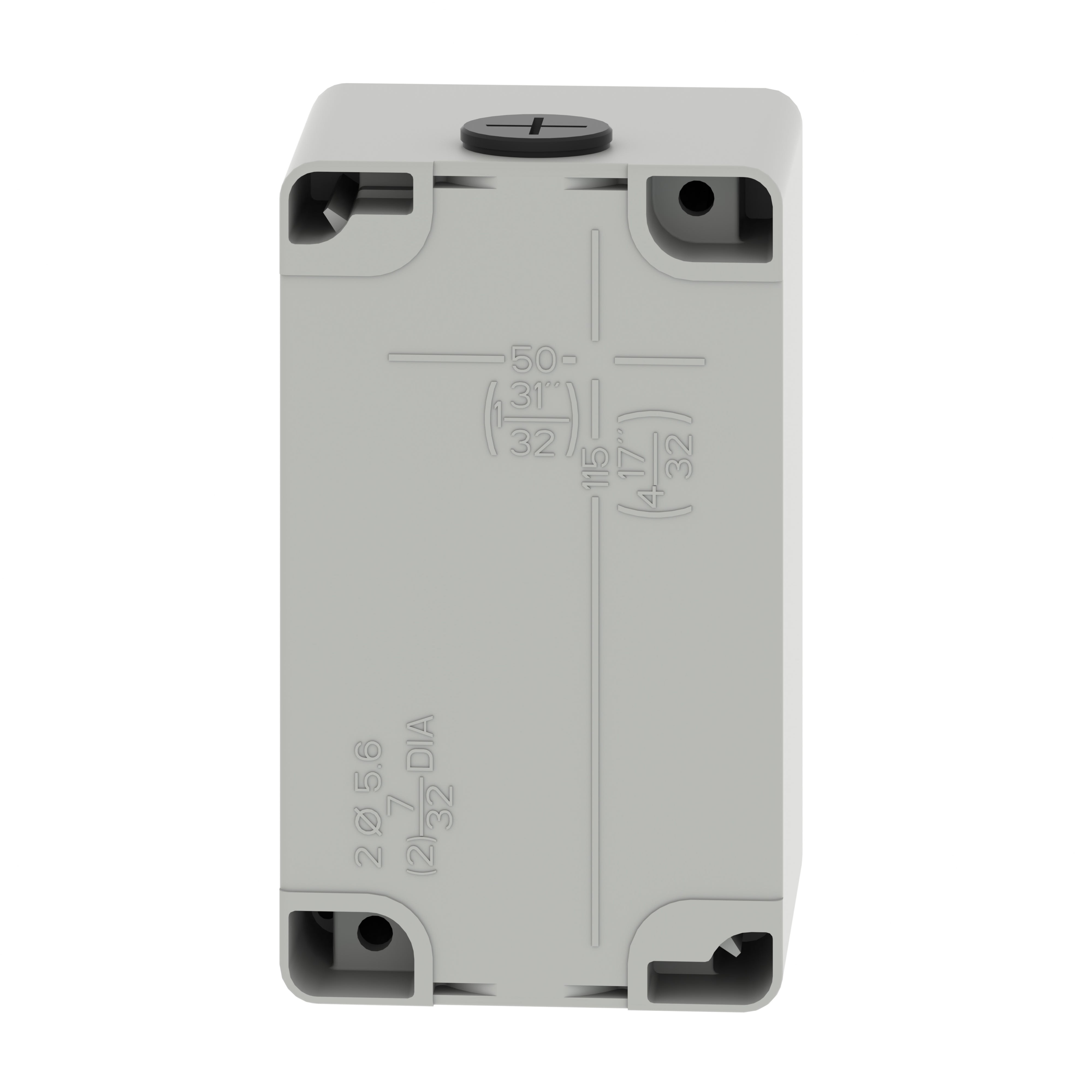 Ce produit fait partie de la gamme XAP, une offre de postes de commandes métalliques pour les séries XB4 et XB5 de boutons-poussoirs Ø 22 mm. XAPD24 est un boîtier vide de couleur grise (RAL7035). Cette version sans trou permet une position personnalisable des boutons-poussoirs sur le couvercle. Il peut également être utilisé comme boîtier de raccordement. Sa dimension laisse un espace confortable pour le câblage. Il est possible de personnaliser le boîtier XAP à l'aide du sélecteur de produit et du configurateur en ligne Harmony. Ce boîtier a été normalisé avec un taraudage pour presse-étoupes ISO pour être entièrement conforme à la norme CEI 62444. Il est livré avec deux trous M20. La protection contre les chocs électriques est de classe I selon EN/IEC 61140 et le niveau de protection contre les chocs mécaniques jusqu'à IK07 selon EN/IEC 62262. Il s'agit d'un boîtier en alliage de zinc et les dimensions sont de 80 x 130 x 77 mm (largeur x hauteur x profondeur)et il pèse 0,830kg. Le boîtier XAPD est conçu pour les fabricants de matériel d'origine (OEM) qui répondent à des exigences d'applications lourdes telles que la manutention des matériaux, l'agroalimentaire, les éoliennes, l'exploitation minière, les minéraux et les métaux (MMM), les véhicules, etc. Ce boîtier est conforme aux normes EN/IEC 60529 et EN/IEC 60947-5-1 et est fourni avec les certifications CE, UL, cULus et EAC. Des marquages entièrement personnalisables sont disponibles pour améliorer l'expérience d'interface et l'esthétique du boîtier. Le boîtier XAP est conçu pour être monté en position verticale et horizontale avec 4 trous de fixation. La forme permet une combinaison entre simplicité, flexibilité de personnalisation et conception attrayante pour les machines. Il est respectueux de l'environnement et conforme aux directives telles que RoHS, DEEE et REACh relatives à la protection de l'environnement.