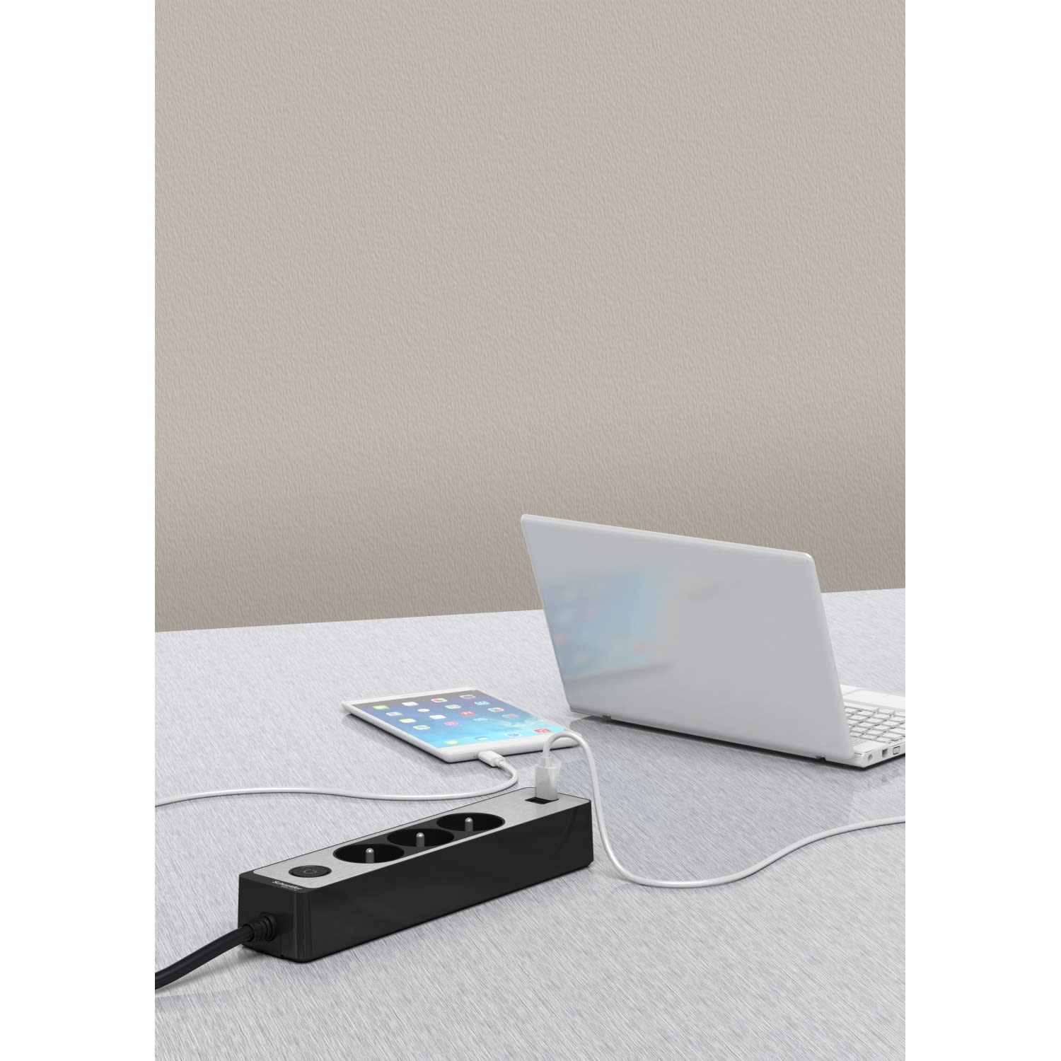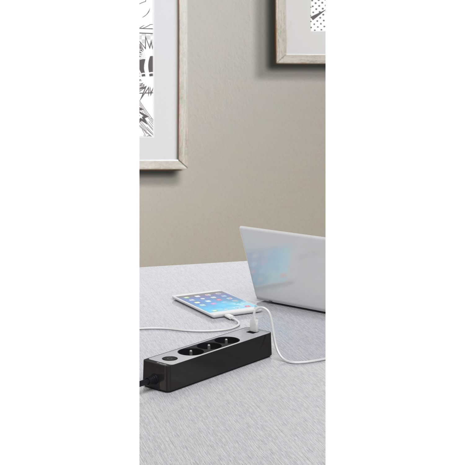 Cette multiprise 5 prises 2P+T en finition anthracite et aluminium brossé est équipée de 2 ports USB type A (puissance maximum 2,4A par port) pour charger smartphones et autres petits appareils électriques. Elle possède un cordon de 1,5m et un interrupteur ON/OFF lumineux pour des économies d'énergie.