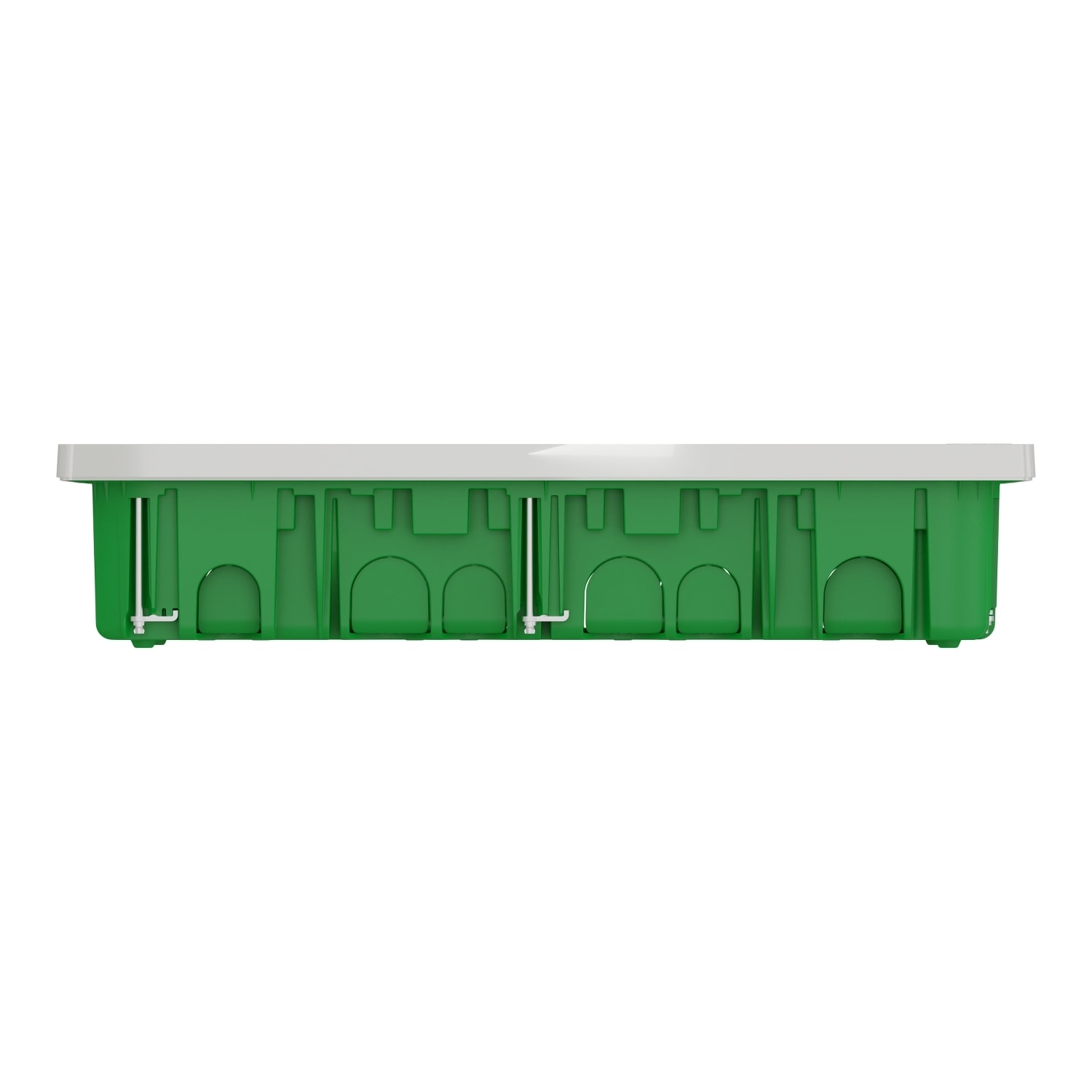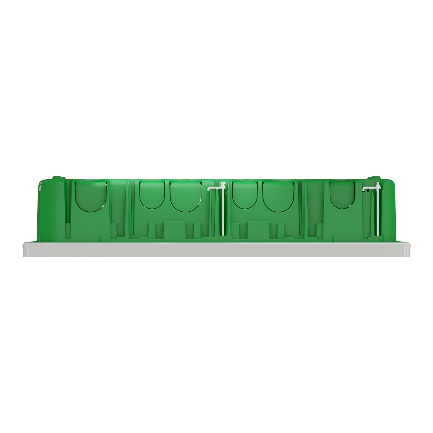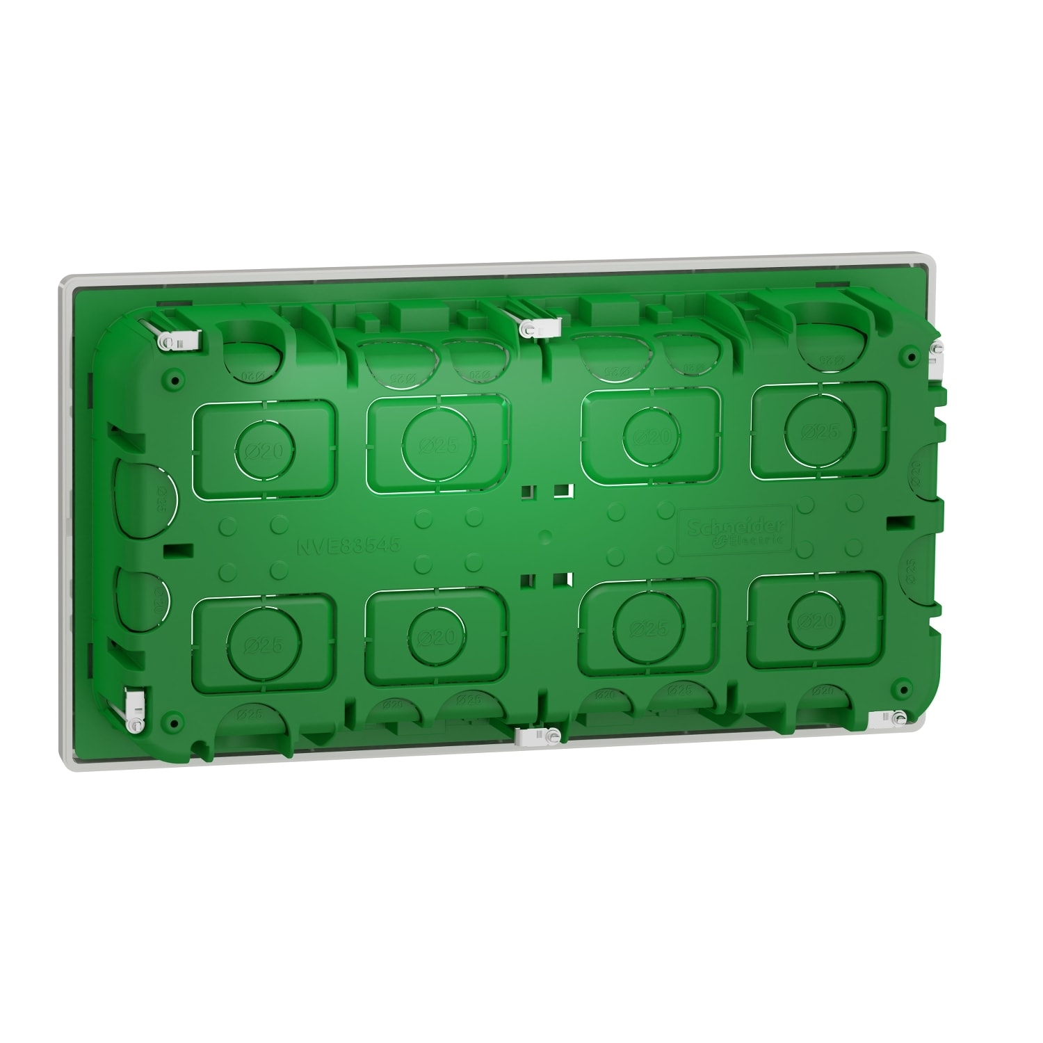 NU174418 se compose d'un boitier encastré, de 4 supports de fixation en plastique et d'une plaque de finition de couleur blanc. Des barrettes de maintien sont inclues.