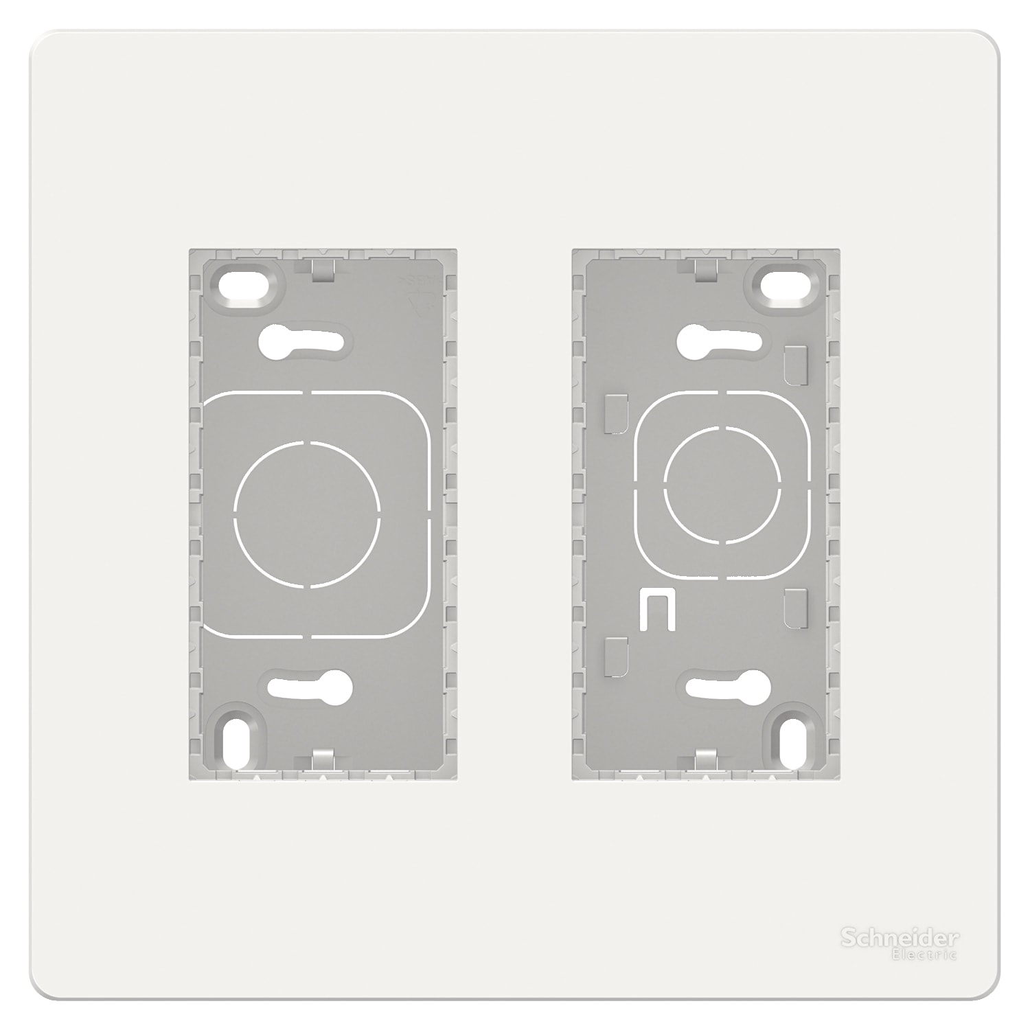 NU122418 se compose d'un support en saillie, de 2 supports de fixation en plastique et d'une plaque de finition de couleur blanc brillant RAL9003. Des barrettes de maintien sont inclues, ainsi que des vis et chevilles pour fixer le produit.