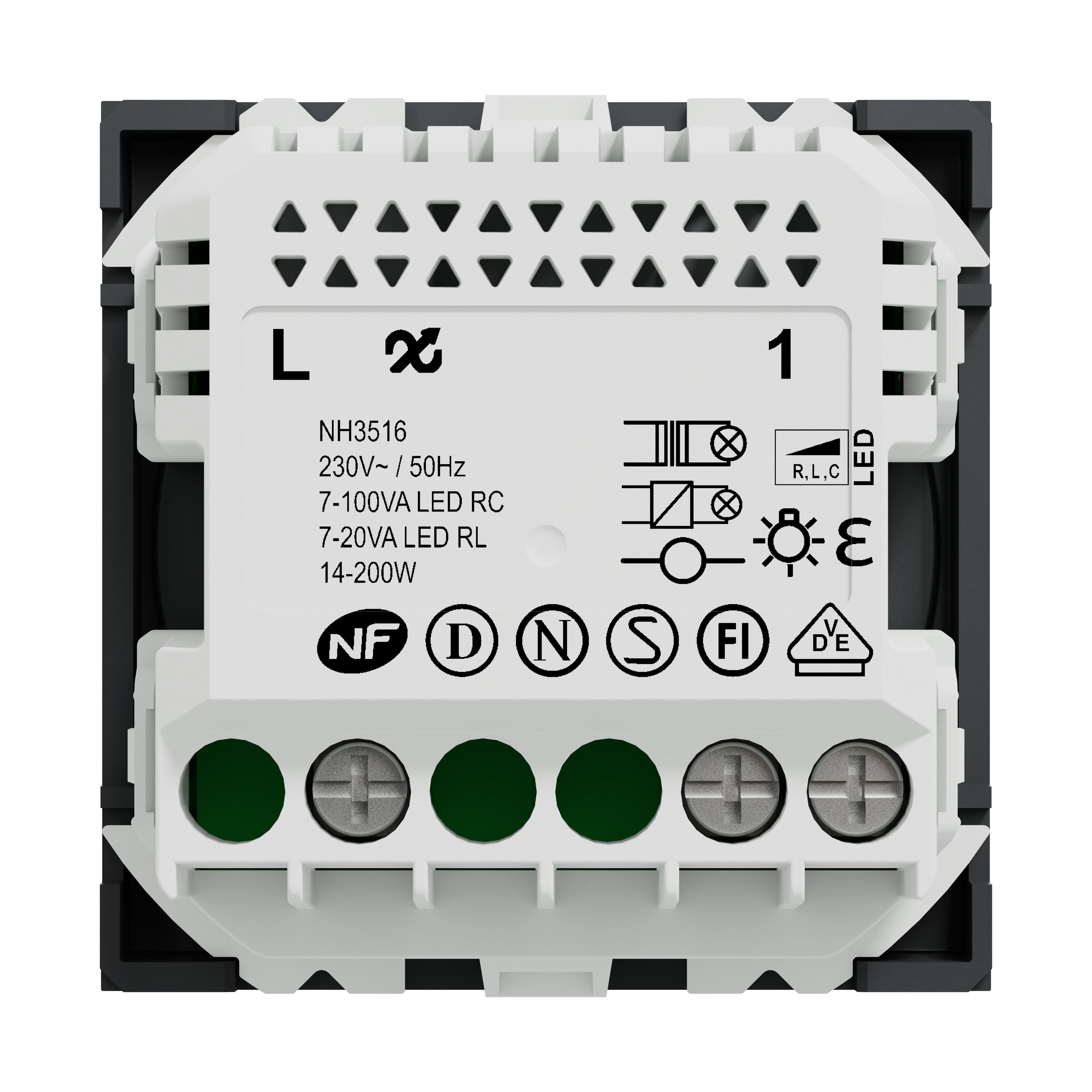 NU351654W se compose d'un un insert avec cache central dont le type de variateur est universel et rotatif 45x45. Dans le cas d'une installation murale, il sera à associer avec un support de fixation (commençant par NU700) et une plaque de finition Unica (Pro, Studio, Pure).