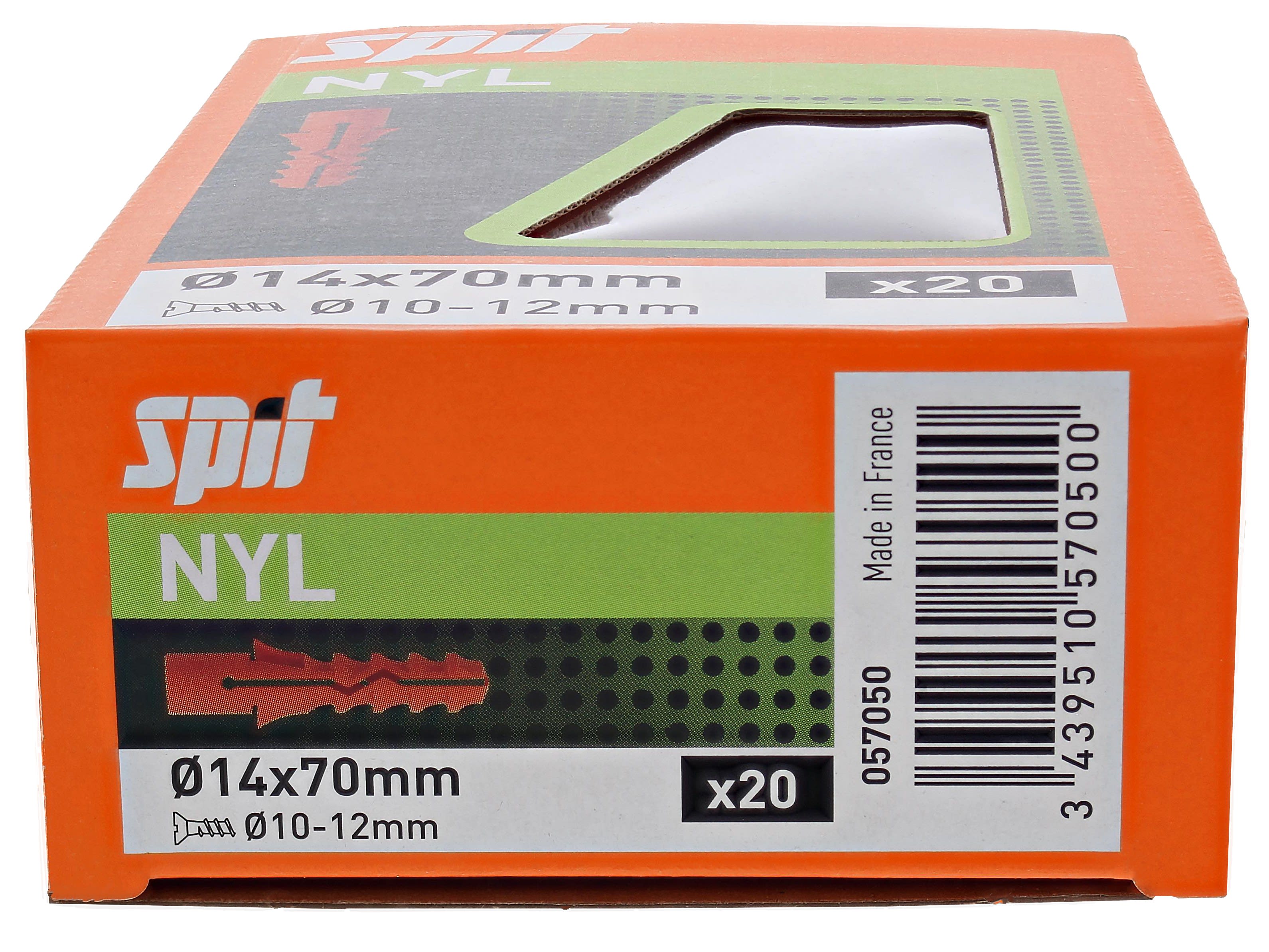 Avantages produit: Tenue optimale dans les matériaux pleins : design unique, 2 ergots et 4 ailettes anti-rotationHaute performance : jusqu'à 80 kg dans le bétonExcellente résistance aux écarts de température : cheville 100% nylon.Disponible avec collerette pour une finition affleuranteDescription produit: Cheville 100% nylon brevetéeApplications: Petit appareillage électriqueÉquipement de salle de bainÉclairageRayonnageDiamètre cheville: 14 mmDiamètre de perçage: 14 mmDiamètre maximal de vis: 12 mmDiamètre minimal de vis: 10 mmLongueur cheville (mm): 70 mmProfondeur d’ancrage: 70 mmProfondeur minimale de perçage: 80 mm