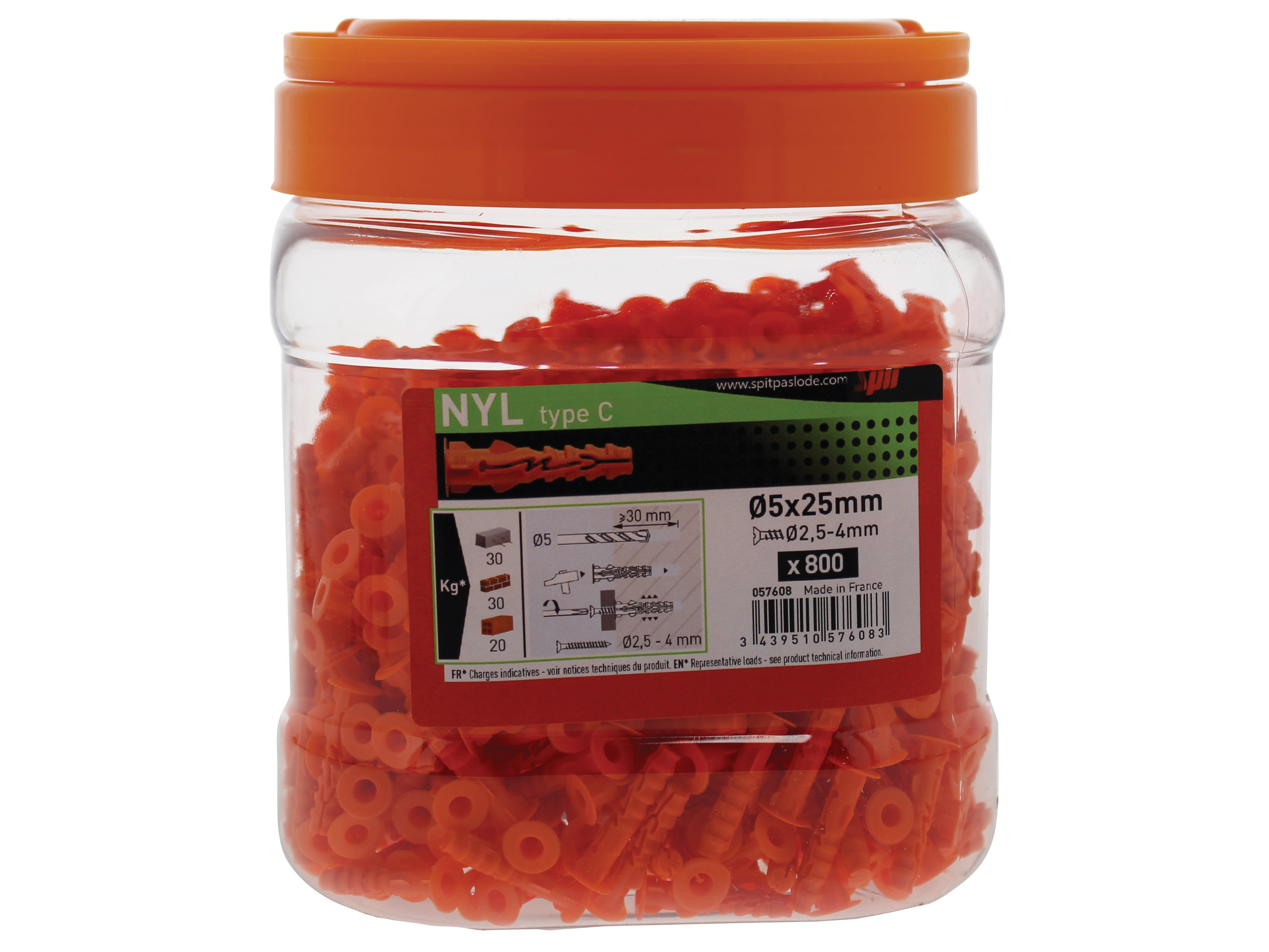 Avantages produit: Tenue optimale dans les matériaux pleins : design unique, 2 ergots et 4 ailettes anti-rotationHaute performance : jusqu'à 80 kg dans le bétonExcellente résistance aux écarts de température: cheville 100% nylon.Description produit: Cheville 100% nylon brevetéeApplications: Petits appareillages électriquesÉquipements de salle de bainÉclairageRayonnageDiamètre cheville: 5 mmDiamètre de la tête: 9 mmDiamètre de perçage: 5 mmDiamètre maximal de vis: 4 mmDiamètre minimal de vis: 2.5 mmLongueur cheville: 25 mmProfondeur d’ancrage: 25 mmProfondeur minimale de perçage: 30 mm
