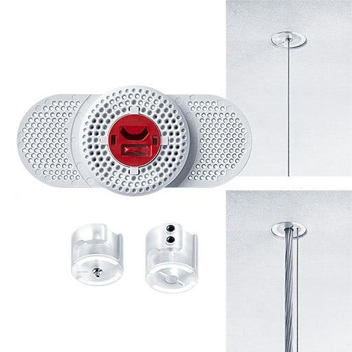 Kit de montage DOT28 pour installation esthétique des luminaires suspendus dans des plafonds en placoplâtre avec 2 points de suspension. Le module pour plâtre est intégré dans les plafonds en placoplâtre, puis enduit. Le luminaire s'installe au plafond avec un cache-piton à baïonnette minimaliste (Ø 28 mm) monté à ras du plafond. N’est pas compatible avec les câbles de suspension Zumtobel Ø 1,2 mm. Le kit comprend 2 modules pour encastrement dans le plâtre, 1 rondelle à enduire, 1 cache-piton à baïonnette transparent permettant la suspension et l’alimentation électrique et 1 cache-piton à baïonnette transparent avec anneau Reutlinger. Charge maximale admissible pour chaque point de suspension : 10 kg (charge totale du kit = 20 kg).