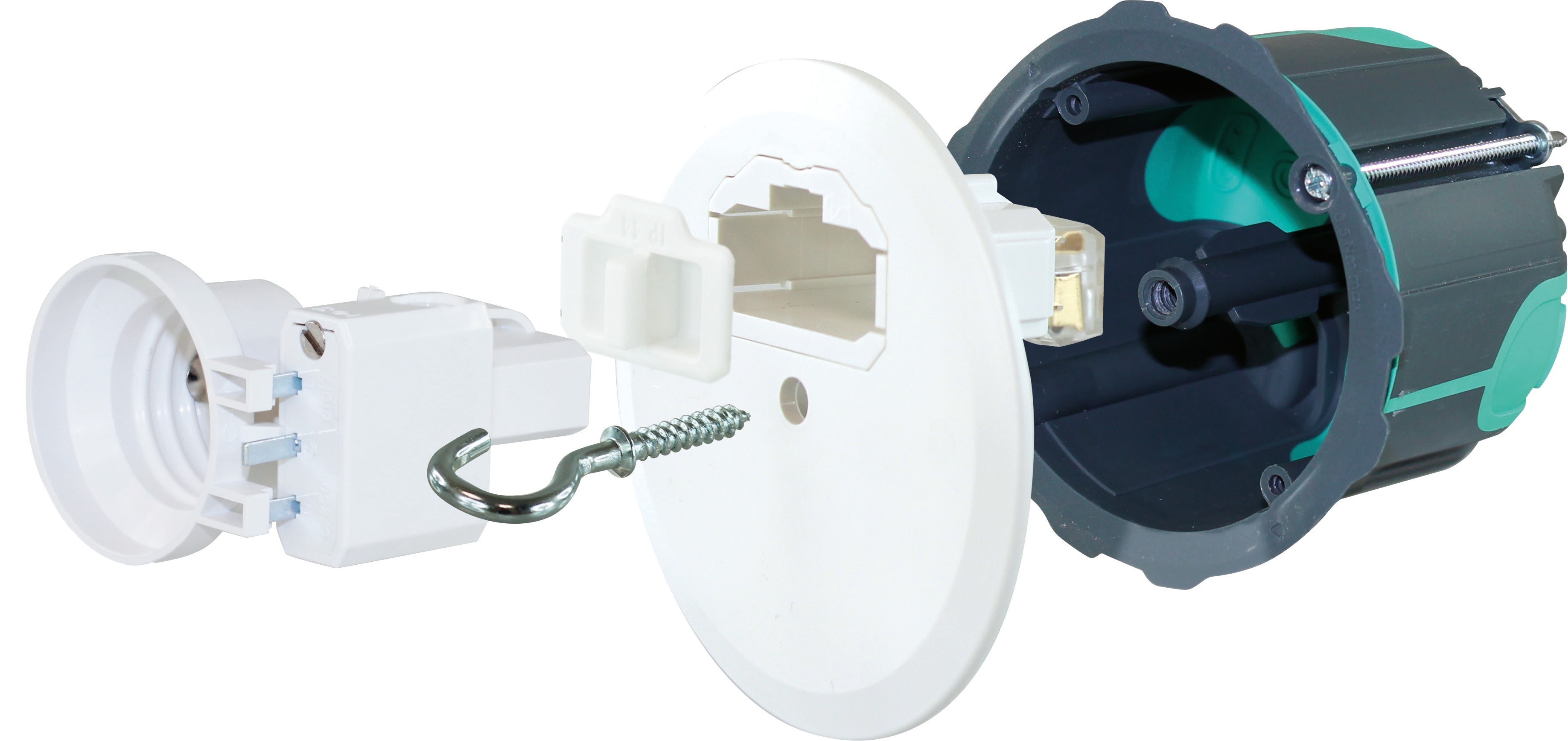 Collerette large : - Fine et profilée, pour un placage parfait au mur et garantie l'étanchéité autour de la boîte.Rigidité élevée : - +15% par rapport à la moyenne des boîtes du marché Nombreuses entrées :- Entrée spécifique pour utilisation avec câble R02V 3G2.5 ou VVF 3G1.5 sans gaine. Lèvre d'étanchéité :- Sur tout le pourtour de la boîte. Renforce l'étanchéité (Garantie étanche à 99%)DCL de haute qualité : - Puit DCL avec connexions transparentes, capot de protection IP44- Couvercle DCL légèrement biseauté, parfaitement plaqué sur la boîte, avec logement pour micromodule intégré. - Piton en acier galvanisé revêtu blanc.- Fiche DCL - douille pour raccordement d'une ampoule E27.