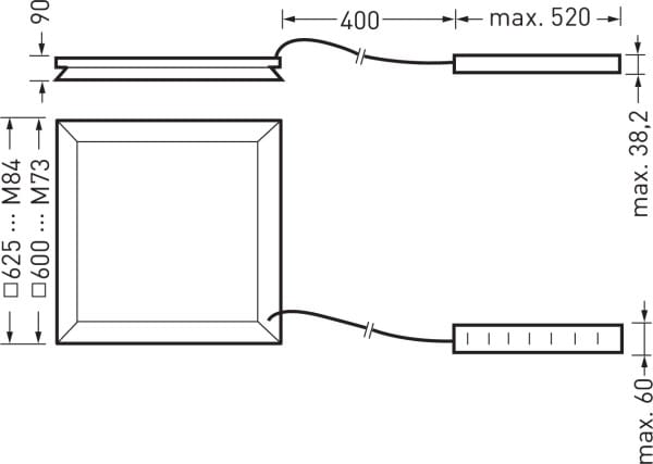 Plafonnier LED carré, à recouvrement à prismes en PMMA. Version M73 (600 mm x 600 mm). Luminaire avec équipement Active pour la commande de la température de couleur au moyen d’un dispositif de commande séparé. Cadre SKY pour un effet de profondeur de l’ambiance intérieure dans un plafond modulaire classique et plat. Le cadre SKY reproduit les contours tridimensionnels d’un éclairage zénithal. Le luminaire peut être équipé en option d’un système d’éclairage de secours à encastrer au plafond, fonctionnant trois heures. Flux lumineux du luminaire en mode de fonctionnement d’éclairage de secours 575 lm. Pour une répartition intensive des intensités lumineuses. Compatible avec les écrans informatiques selon la norme EN 12464-1 grâce à des luminosités réduites L ≤ 3 000 cd/2 pour des angles d’éclairage supérieurs à 65 °, de manière omnidirectionnelle. Effet lumineux harmonieux grâce à une sortie de lumière uniformément éclairée. Les indications suivantes relatives au flux lumineux du luminaire et à la puissance raccordée du système valent pour un fonctionnement de ce luminaire à une température de couleur au réglage dynamique (HCL) et fonctionnant à une température de couleur blanc chaud (2 700 K). Flux lumineux du luminaire 4200 lm, puissance raccordée 40,00 W, rendement lumineux du luminaire 105 lm/W. Teinte de lumière variable (blanc chaud - blanc lumière du jour), température de couleur (CCT) variable (2 700 K - 6 000 K), indice général de rendu des couleurs (IRC) Ra > 80. Durée de vie assignée moyenne L80(tq 25 °C) = 100.000 h. La source lumineuse est remplaçable conformément aux exigences d'écoconception (Règlement (UE) 2019/2020). Corps de luminaire en tôle d’acier. (RAL 9016). Dimensions (L x l): 598 mm x 598 mm, hauteur du luminaire 90 mm. Indice de protection par le dessous IP40. Classe électrique (EN 61140) : I, indice de protection (norme EN 60529) : IP20, degré de résistance aux chocs selon la norme CEI 62262 : IK03, température d’essai au fil incandescent selon la norme CEI 60695-2-11 : 650 °C. Poids: 5.2 kg. Avec bornier de raccordement 5 pôles jusqu’à 2,5 mm2 pour raccordement secteur et repiquage secteur. Raccord et transmission DALI jusqu’à 1,5 mm2. Le raccordement secteur du ballast s’effectue au moyen d’un bornier de raccordement. Pour une installation simple et rapide, le raccordement entre le luminaire et le branchement secondaire du ballast s’effectue au moyen d’un connecteur. À driver externe pour la commutation, la gradation et la commande de la température de couleur au moyen d’un dispositif de commande DALI de type 8. Appareillage conf. au standard DALI 2 (EN 62386). L'appareillage est remplaçable conformément aux exigences d'écoconception (Règlement (UE) 2019/2020). Appareillage protégé contre le mode à vide, les raccordements incorrects, les courts-circuits, surcharges et surtempératures. Ondulation de sortie de l’appareillage ≤ 4 % pour une commande efficace du système LED et une lumière sans scintillement. Il est possible de raccorder le luminaire sans problème même à l’appareillage sous tension. Le luminaire convient à un fonctionnement sur un réseau à tension continue 230 V.