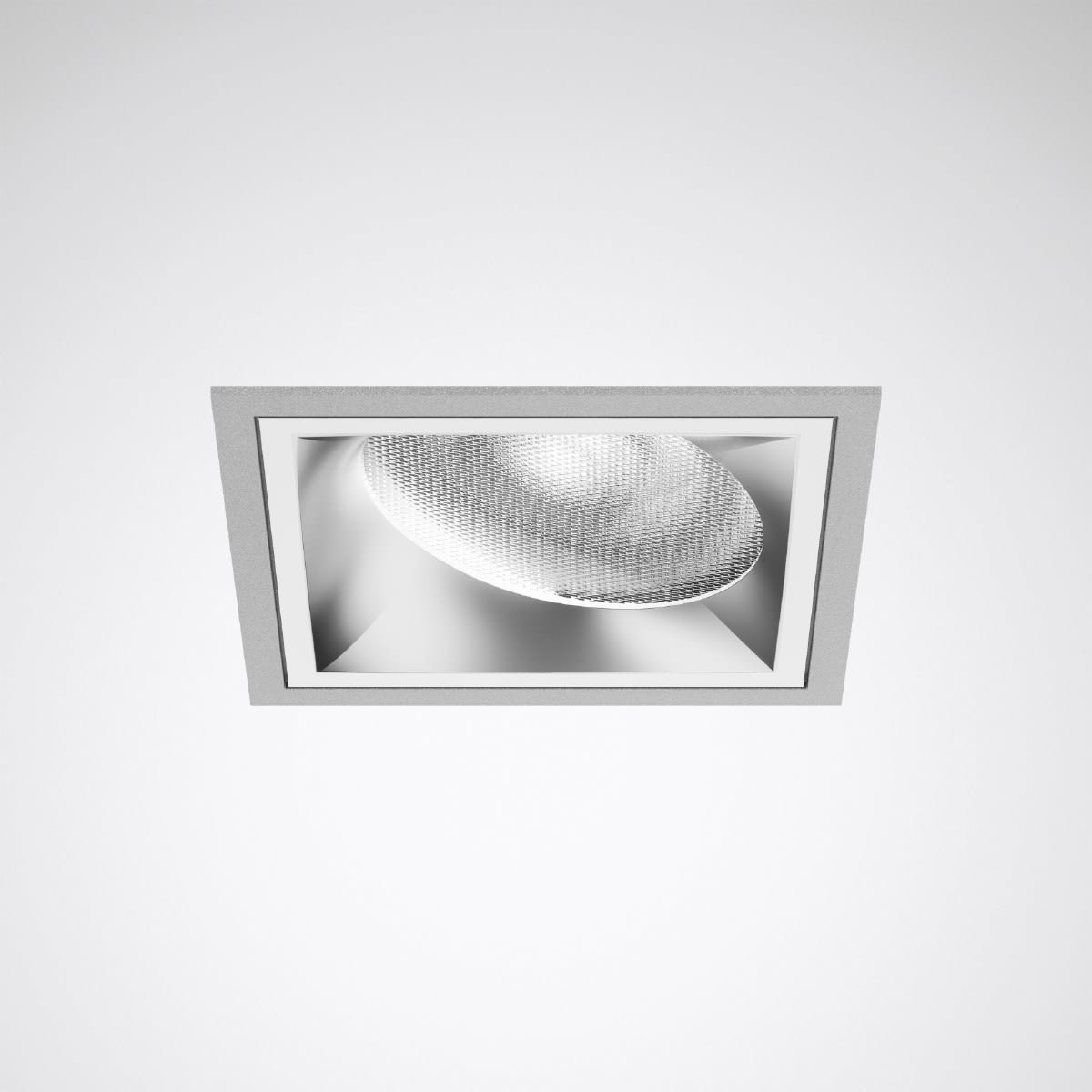 Spot encastré compact carré LED. Downlight encastré avec bord pour découpes de plafond. Convient pour une utilisation dans les entreprises certifiées HACCP, IFS et/ou BRC Global Standard Food. Découpe dans le plafond 150 mm x 150 mm, Profondeur d’encastrement > 130 mm. Avec réflecteur en plastique, métallisé, brillant mat. Le système optique avec une combinaison précisément adaptée de lentilles LED et d'éléments anti-éblouissants offre un très grand confort visuel accompagné d'une performance d'éclairage très élevée. Wallwasher à répartition asymétrique des intensités lumineuses. Guidage de la lumière via une technologie de collimateurs/lentilles. Flux lumineux du luminaire et couleur de la lumière fixes. Flux lumineux du luminaire 2000 lm, puissance raccordée 24 W - 24 W, rendement lumineux maximale du luminaire 83 lm/W. Teinte de lumière blanc chaud, température de couleur (CCT) 3000 K, indice général de rendu des couleurs (IRC) Ra > 90. Tolérance de localisation chromatique (initialement MacAdam) ≤ 3 SDCM. Durée de vie assignée moyenne L80 (tq 25 °C) = 100.000 h., Durée de vie assignée moyenne L90 (tq 25 °C) = 50.000 h. La source lumineuse est remplaçable conformément aux exigences d'écoconception (Règlement (UE) 2019/2020). Boîtier, anneau de montage et dissipateur thermique en fonte d'aluminium. Surface à revêtement gris argent (similaire à RAL 9006). Dimensions extérieures de la collerette 165 mm x 165 mm. hauteur du luminaire 132.5 mm. Classe électrique (EN 61140) : II, indice de protection (norme EN 60529) : IP20, Indice de protection par le dessous : IP44, degré de résistance aux chocs selon la norme CEI 62262 : IK06, température d’essai au fil incandescent selon la norme CEI 60695-2-11 : 850 °C. Température ambiante admissible (ta): -20 °C à 25 °C. Poids: 1.3 kg. Branchement au secteur via borne enfichable avec équipement de repiquage secteur. La connexion entre le luminaire et l'appareillage est enfichable. Luminaire câblé sans halogène. Avec appareillage électronique, à gradation numérique (DALI). Appareillage conf. au standard DALI 2 (EN 62386). Possibilité de commutation et de gradation du luminaire au moyen de la fonction bouton-poussoir via les bornes de commande DALI (TouchDim). L'appareillage est remplaçable conformément aux exigences d'écoconception (Règlement (UE) 2019/2020). Ce luminaire qui est prêt au monitoring (MOR) fournit des données d’exploitation permettant une surveillance ou une maintenance prédictive, il est donc compatible avec les services de TRILUX Monitoring Services. Le produit répond aux exigences essentielles des directives européennes applicables et de la loi sur la sécurité des produits et porte le marquage CE. Le luminaire est en outre certifié ENEC par un organisme de contrôle indépendant.