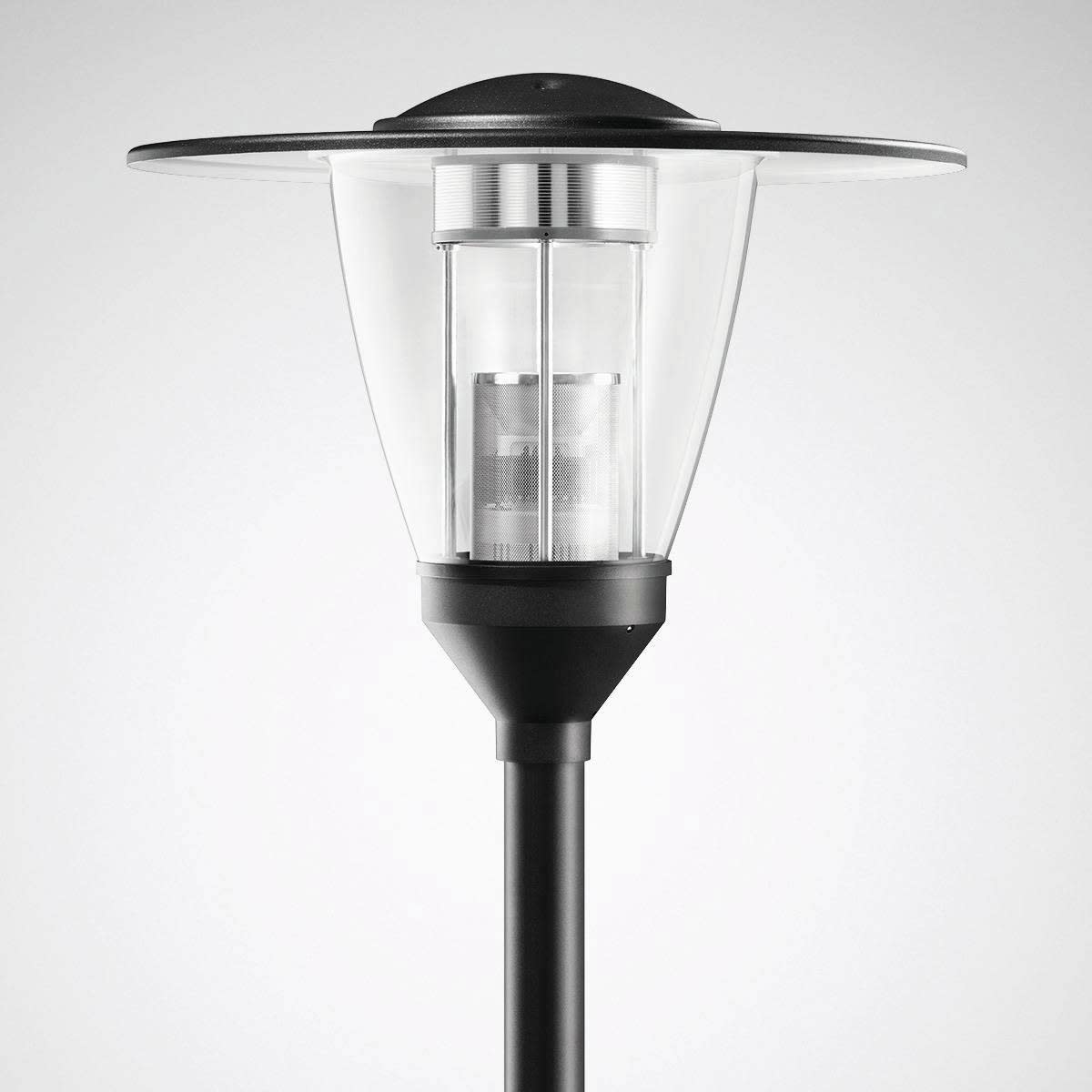 Luminaire LED conique classique décoratif pour montage sur mât droit. Avec réduction de la puissance autonome via la phase de commande. Système optique en aluminium anodisé grand brillant. À répartition asymétrique extensive des intensités lumineuses. Flux lumineux du luminaire et couleur de lumière fixes, avec maintien du flux lumineux en fin de vie (CLO). Avec système LED Flux lumineux du luminaire 1800 lm, puissance raccordée 24 W, rendement lumineux maximale du luminaire 75 lm/W. Teinte de lumière blanc chaud, température de couleur (CCT) 3000 K, indice général de rendu des couleurs (IRC) Ra > 80. Tolérance de localisation chromatique (initialement MacAdam) ≤ 3 SDCM. Durée de vie assignée moyenne L80(tq 25 °C) = 50.000 h. La source lumineuse est remplaçable conformément aux exigences d'écoconception (Règlement (UE) 2019/2020). Corps de luminaire en aluminium moulé sous pression, toit de luminaire en aluminium résistant à la corrosion, haute résistance aux intempéries, revêtement poudré. Couleur extérieure du corps et du toit de luminaire : noir profond analogue à RAL 9005. Toit du luminaire, blanc à l’intérieur, revêtement poudré. Revêtement convenant à un climat maritime, sur demande. Cylindre de fermeture en PMMA à haute résistante aux chocs, clair. Recouvrement de luminaire pouvant être glissé vers le haut dans une position de service autobloquante. Classe électrique (EN 61140) : II, indice de protection (norme EN 60529) : IP23, Indice de protection du compartiment de la lampe: IP65. degré de résistance aux chocs selon la norme CEI 62262 : IK04. Indice de protection du compartiment de la lampe: IP65. Mât disponible sur demande. Surface exposée au vent Fw 0.470 m2. Poids: 7.3 kg. Avec driver. L'appareillage est remplaçable conformément aux exigences d'écoconception (Règlement (UE) 2019/2020). Bloc électrique avec tous ses composants électriques, remplaçables sans outil. Résistance aux pics de tension Mode différentiel / mode commun : 6 kV / 10 kV. Le produit répond aux exigences essentielles des directives européennes applicables et de la loi sur la sécurité des produits et porte le marquage CE. Le luminaire est en outre certifié ENEC par un organisme de contrôle indépendant.