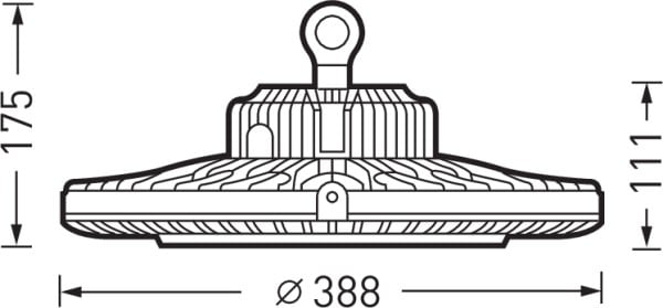 Armature industrielle LED pour montage suspendu. Convient pour une utilisation dans les entreprises certifiées HACCP, IFS et/ou BRC Global Standard Food (DIN 10500). Avec température de surface limitée, convient pour une utilisation dans des locaux à risque d'incendie selon DIN EN 60598-2-24. Pour montage suspendu individuel. Suspension à un point sur crochet à visser, intégré au centre. Accessoires de montage à commander séparément. Système optique avec optique à lentilles PC. Avec une unité optique par module LED. À répartition intensive-extensive symétrique en rotation des intensités lumineuses. Flux lumineux du luminaire 10600 lm, puissance raccordée 95,00 W, rendement lumineux du luminaire 111 lm/W. Teinte de lumière blanc neutre, température de couleur (CCT) 4000 K, indice général de rendu des couleurs (IRC) Ra > 80. Durée de vie assignée moyenne L80(tq 25 °C) = 50.000 h, Durée de vie assignée moyenne L70(tq 25 °C) = 60.000 h. La source lumineuse est remplaçable conformément aux exigences d'écoconception (Règlement (UE) 2019/2020). Boîtier robuste en Aluminium moulé sous pression avec ailettes de refroidissement intégrées. Surface au revêtement gris argent . Diamètre du luminaire 388 mm, Hauteur du luminaire 175 mm. Température ambiante admissible (ta): -25 °C - +35 °C. Classe électrique (EN 61140) : I, indice de protection (norme EN 60529) : IP65, degré de résistance aux chocs selon la norme CEI 62262 : IK08, température d’essai au fil incandescent selon la norme CEI 60695-2-11 : 650 °C. Poids: 6,8 kg. Le raccordement secteur s'effectue au moyen d'un câble d'alimentation à 3 pôles. Avec driver. Le produit répond aux exigences essentielles des directives européennes applicables et de la loi sur la sécurité des produits et porte le marquage CE. Le luminaire est en outre certifié ENEC par un organisme de contrôle indépendant.